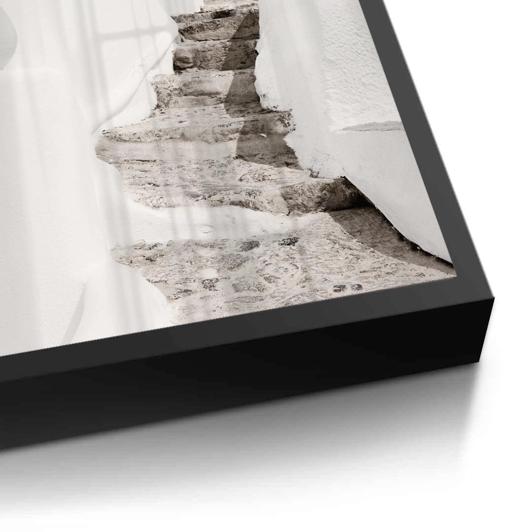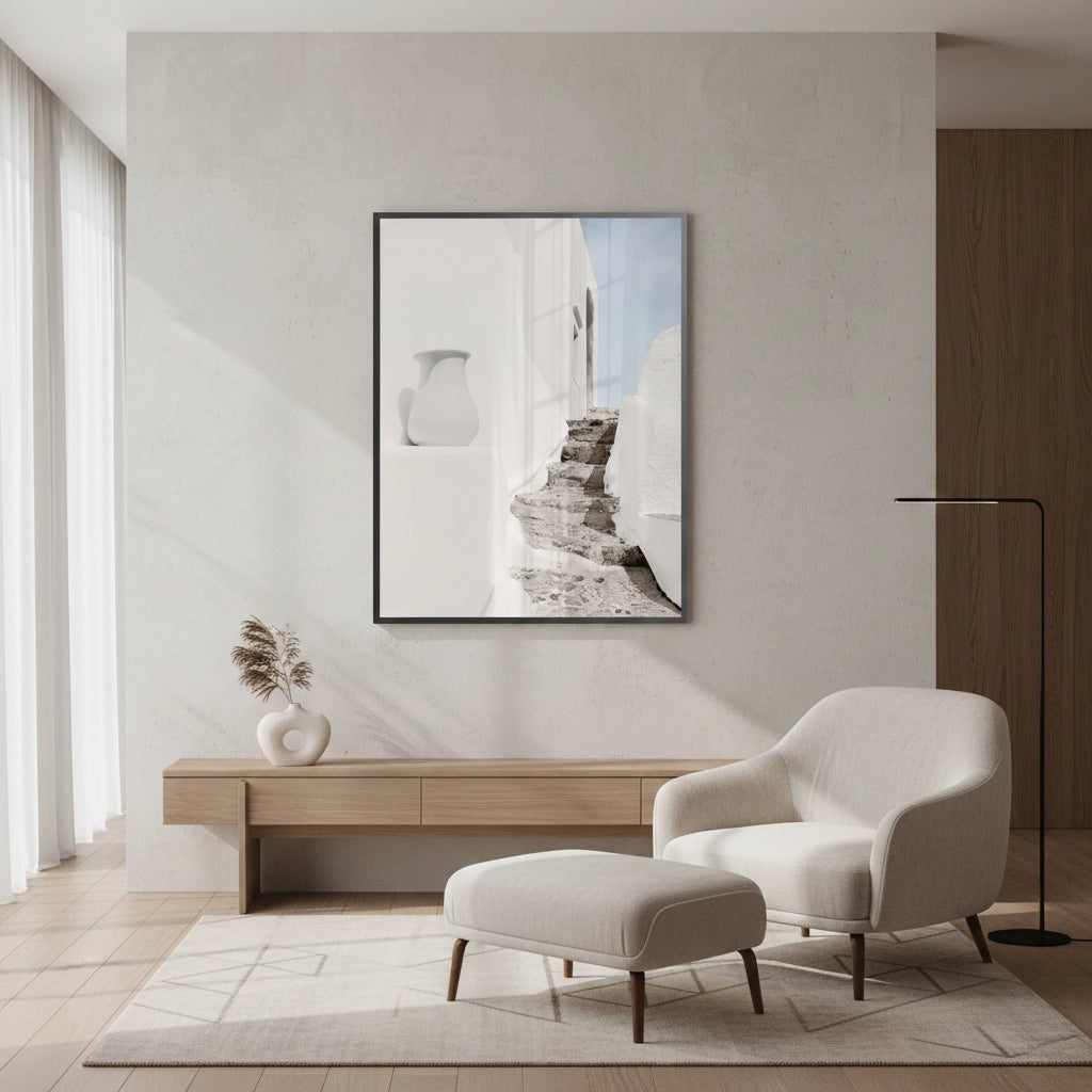 Embrace the serenity of coastal living with the Mediterranean White Alley art print. This ethereal piece captures a charming sun-drenched pathway, featuring rustic stone steps and minimalist white-washed walls. A subtle white ceramic vase in the foreground adds a touch of organic elegance to the scene. The bright, high-key palette of whites and soft neutrals creates an open, airy feeling, while the premium vertical texture provides a sophisticated, high-end finish. Perfect for bringing a calming, vacation-inspired vibe to a modern bedroom, a bright living room, or a chic coastal home in Dubai.