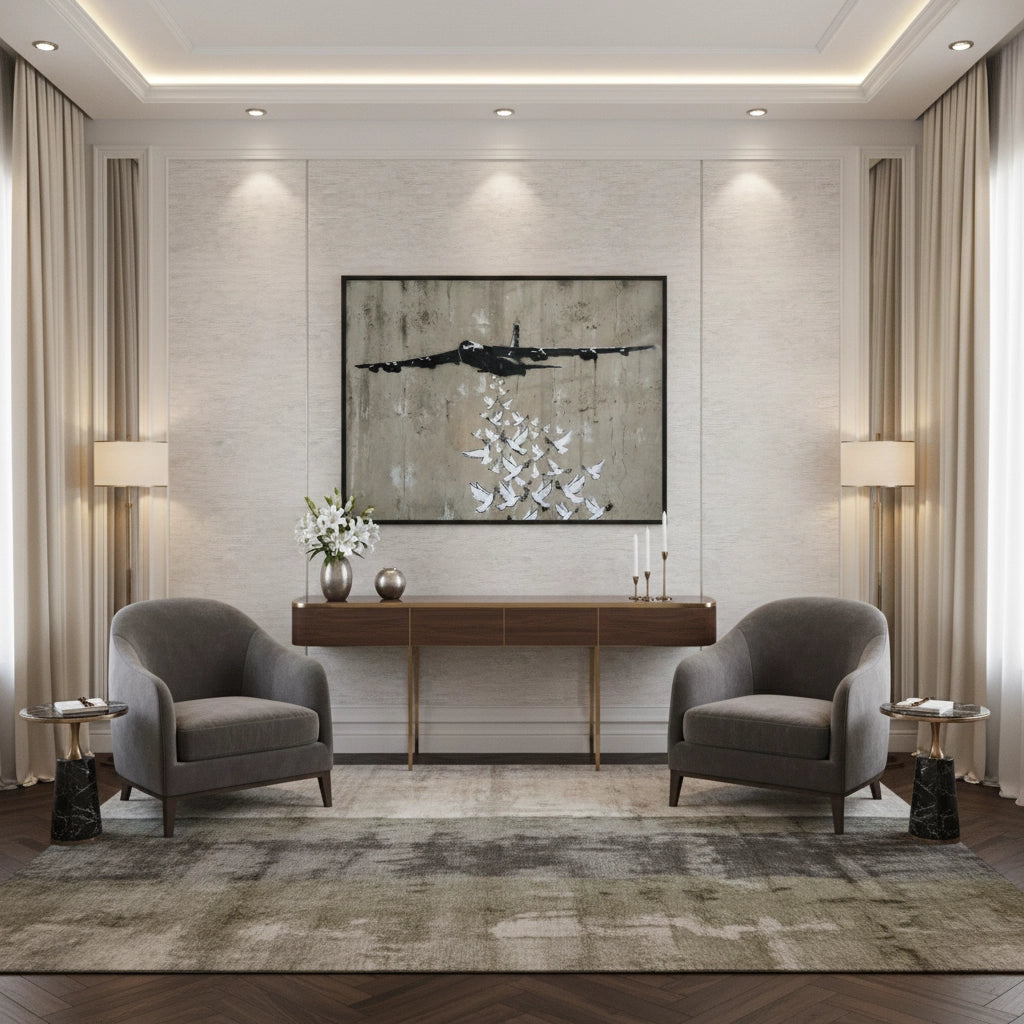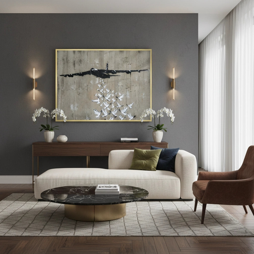 Bring a powerful narrative of peace to your space with the Peace Bomber from Jasmine Art’s Banksy series. This iconic stencil-style print features a military plane releasing a flock of peace doves instead of bombs, set against a raw, distressed concrete wall. Its poignant composition and high-contrast monochromatic palette make it a soul-stirring focal point for any contemporary interior. Finished with our signature premium vertical texture, this print offers exceptional tactile depth and a high-end gallery finish. A meaningful statement piece for a modern lounge, a study, or a minimalist office in Dubai.