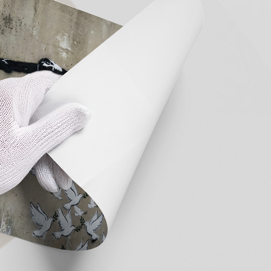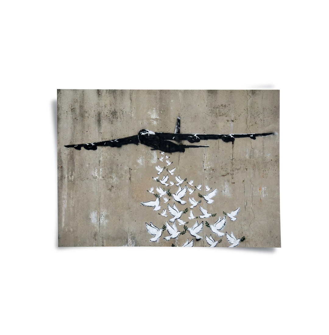 Bring a powerful narrative of peace to your space with the Peace Bomber from Jasmine Art’s Banksy series. This iconic stencil-style print features a military plane releasing a flock of peace doves instead of bombs, set against a raw, distressed concrete wall. Its poignant composition and high-contrast monochromatic palette make it a soul-stirring focal point for any contemporary interior. Finished with our signature premium vertical texture, this print offers exceptional tactile depth and a high-end gallery finish. A meaningful statement piece for a modern lounge, a study, or a minimalist office in Dubai.