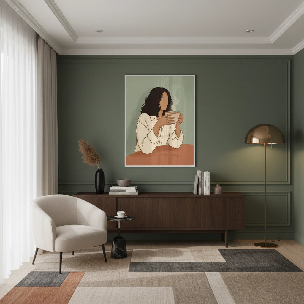 Embrace the beauty of a quiet moment with the Minimalist Morning Coffee from Jasmine Art’s Bohemian series. This elegant faceless portrait captures a serene woman enjoying her daily brew, rendered in a sophisticated palette of sage green, cream, and terracotta. Its minimalist aesthetic and clean lines make it a versatile addition to any modern interior. Finished with our signature premium vertical texture, this print offers a luxurious tactile experience and exceptional gallery depth. A perfect chic addition for a modern kitchen, a cozy breakfast nook, or a trendy café in Dubai.