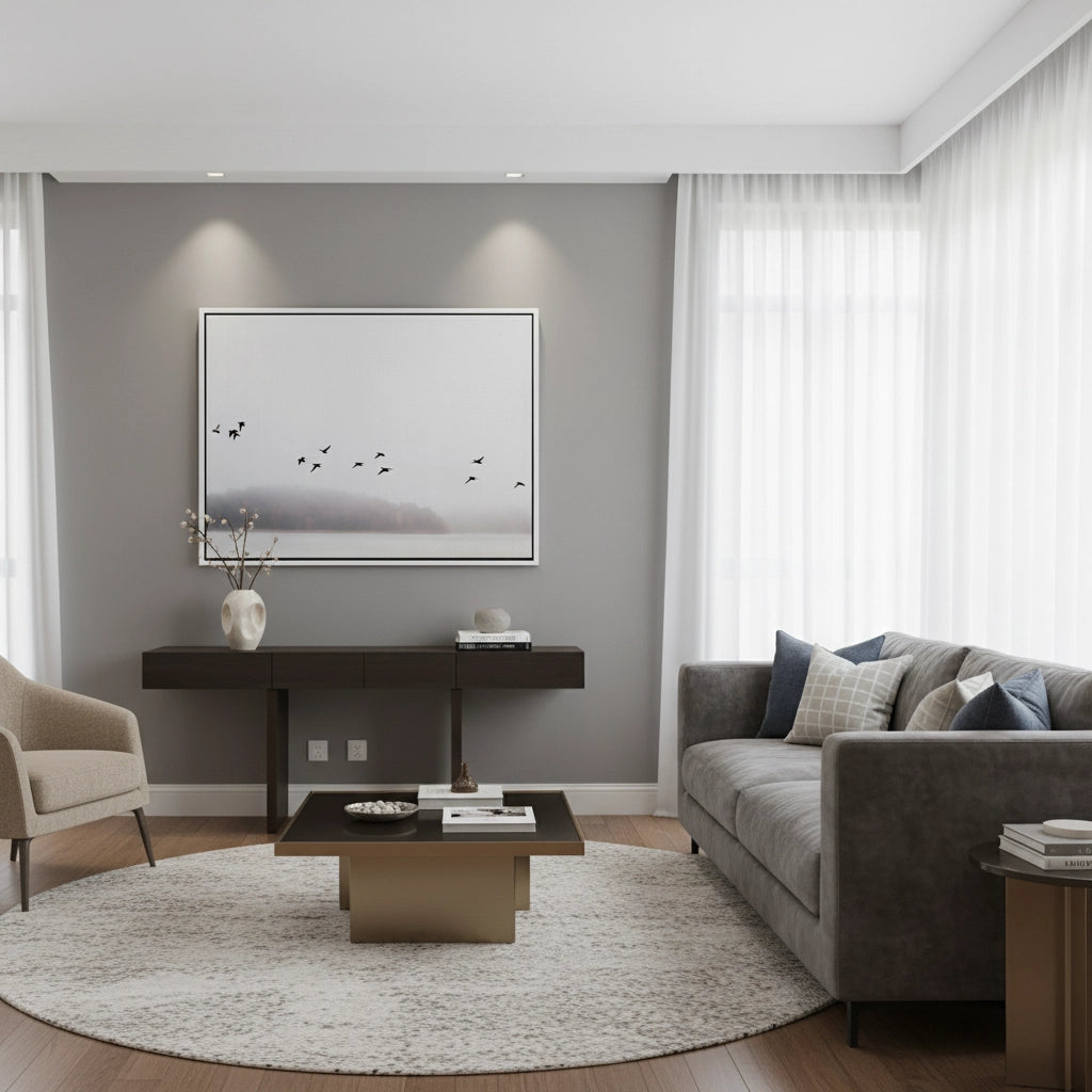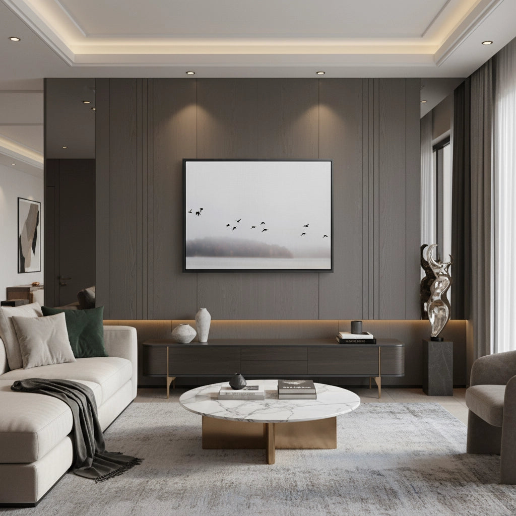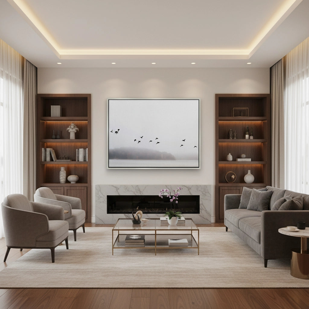 The profoundly calming Minimalist Birds Over Misty Lake print is an ode to tranquil natural landscapes. This canvas captures a flock of black birds soaring above a misty lake, set against a soft, ethereal background in muted neutral tones. This piece offers an atmosphere of serene sophistication and minimalist luxury, making it an exquisite addition to any contemporary bedroom or calming office space in Dubai.