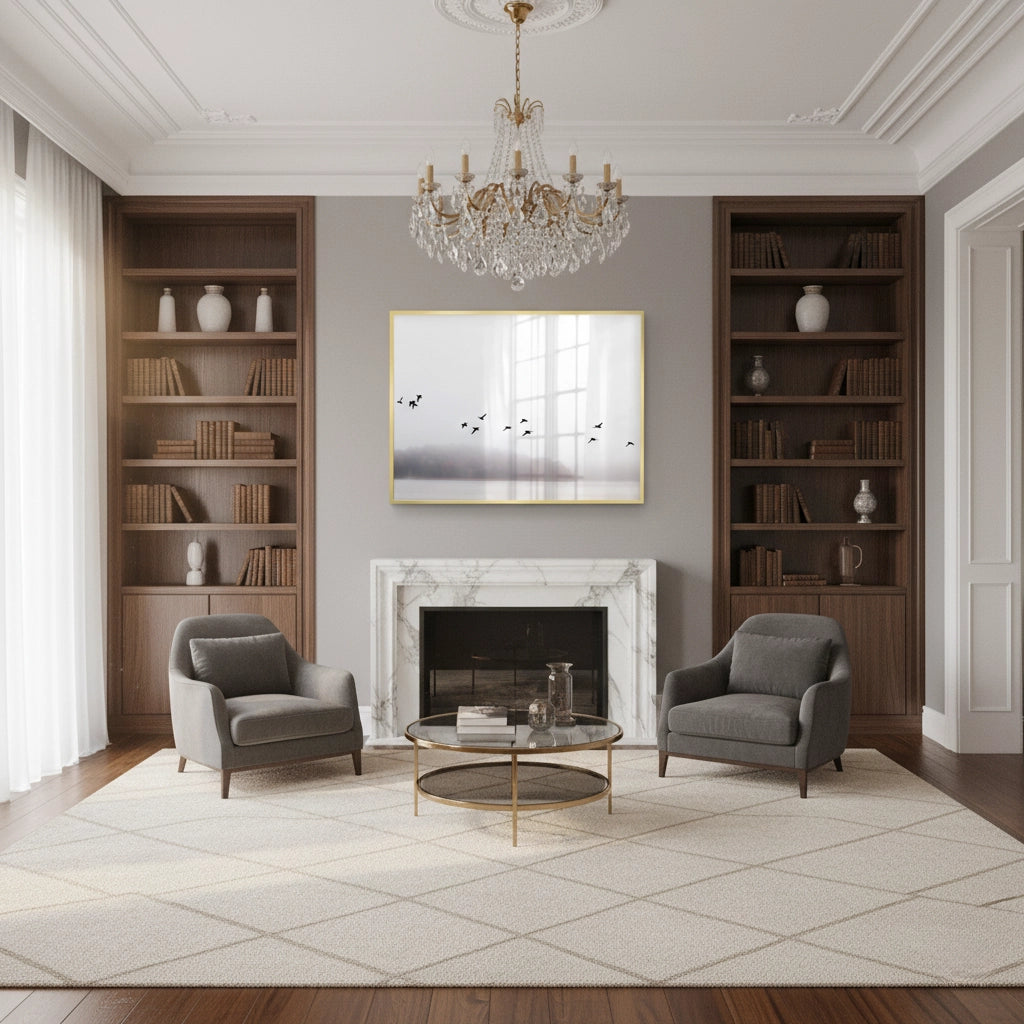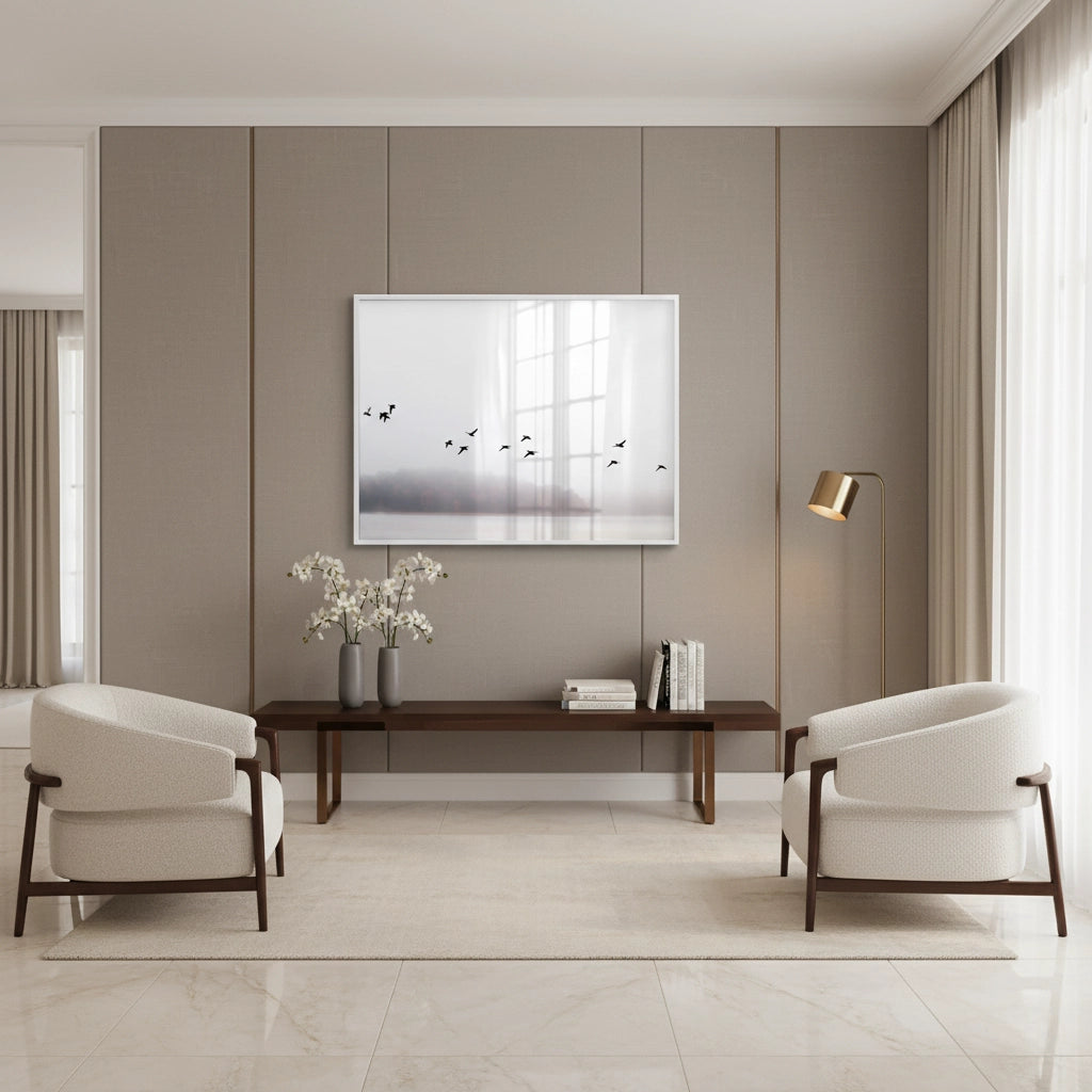 The profoundly calming Minimalist Birds Over Misty Lake print is an ode to tranquil natural landscapes. This canvas captures a flock of black birds soaring above a misty lake, set against a soft, ethereal background in muted neutral tones. This piece offers an atmosphere of serene sophistication and minimalist luxury, making it an exquisite addition to any contemporary bedroom or calming office space in Dubai.