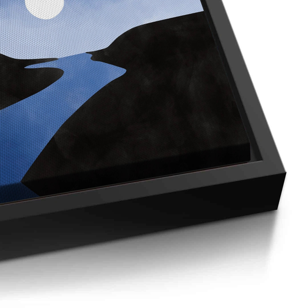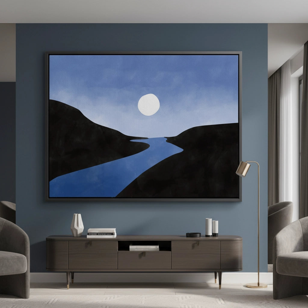 The striking Minimalist Blue River print is a contemporary take on a serene abstract landscape. This canvas features a vibrant blue river flowing between dramatically contrasting dark, abstract hills, set beneath a pale sky. Its bold, clean lines and rich color blocking offer a statement of sophisticated minimalism and artistic tranquility, perfect for a modern living area or office in Dubai.