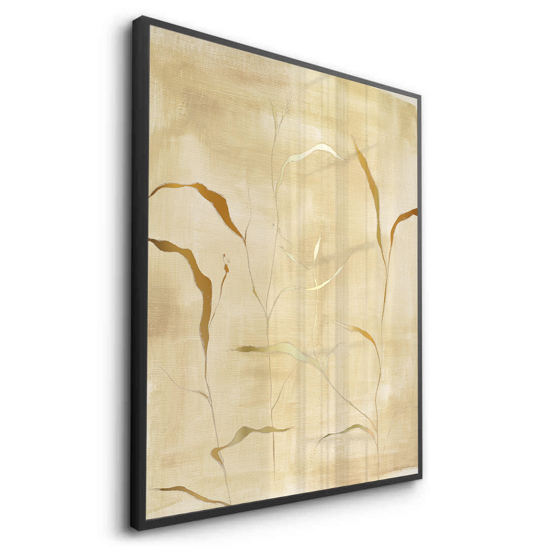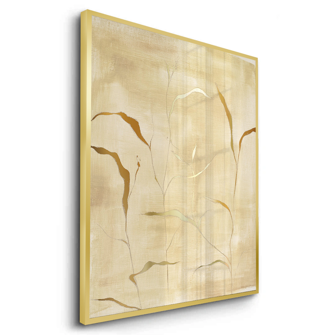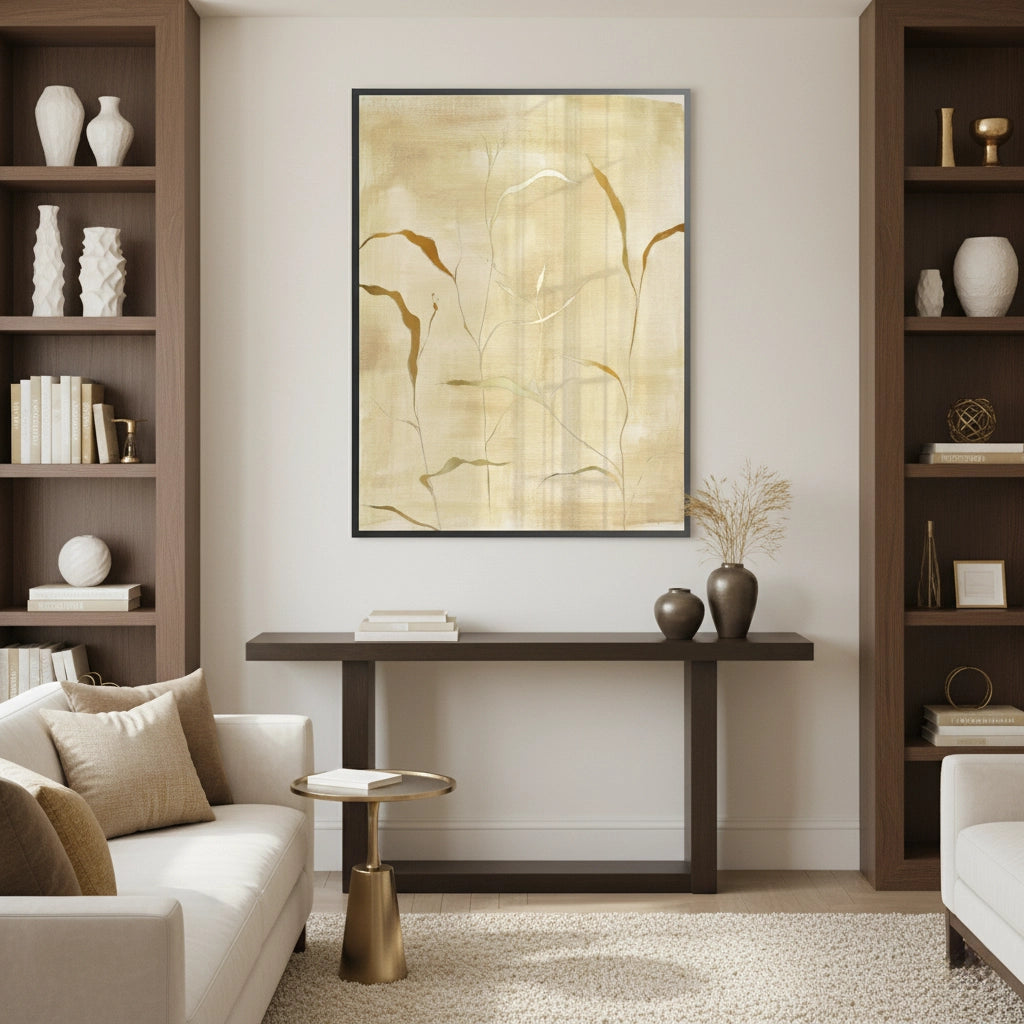 The elegant Minimalist Gold Grass Botanical print is the ultimate statement in understated luxury and serene design. This canvas features delicate, long blades of stylized grass, rendered entirely in shimmering metallic gold foil. The artwork's neutral beige and tan background enhances the reflective quality of the gold, creating a warm, tranquil piece. It is perfect for bringing a subtle, designer botanical touch to any modern, sophisticated interior in Dubai.