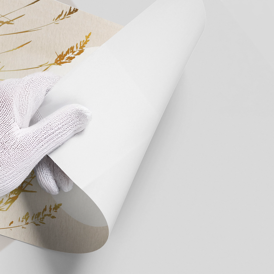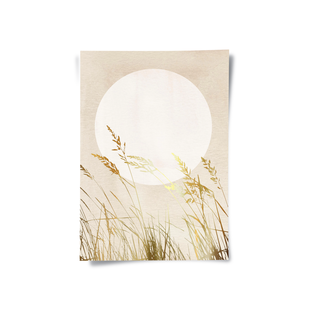 The effortlessly elegant Minimalist Gold Grass print is the epitome of quiet luxury and sophisticated minimalism. This canvas features delicate, long grass stems rendered in stunning, reflective metallic gold foil. Set against a soft, sun-drenched neutral background with a large white celestial circle, this piece provides a warm, tranquil focal point. It is ideal for adding a touch of designer serenity to any modern home or office in Dubai.