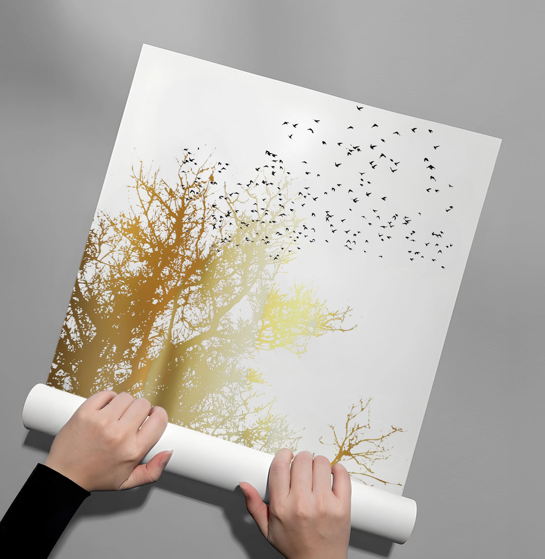 The effortlessly chic Minimalist Gold Tree print is a statement of abstract nature luxury. This canvas features the elegant, abstract silhouette of bare trees, dramatically rendered in reflective metallic gold foil against a clean, light background. A scattering of birds adds depth to the scene. This piece provides a glamorous, yet calming focal point, perfect for adding a touch of sophisticated minimalism and sparkle to any modern home or office in Dubai.