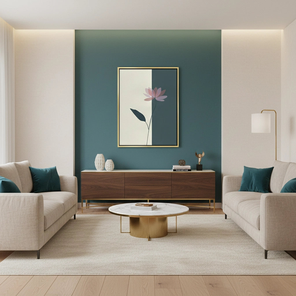 Find your inner peace with Zen Lotus from Jasmine Art’s Bohemian collection. This modern masterpiece features a translucent lotus flower set against a striking slate blue and cream split-tone background. The minimalist composition and soft rose hues evoke a sense of tranquility and contemporary elegance. Finished with our signature premium vertical-ribbed texture, this print offers exceptional tactile depth and a high-end gallery finish. A sophisticated statement piece for a zen bedroom, a minimalist spa-like bathroom, or a luxury office in Dubai.
