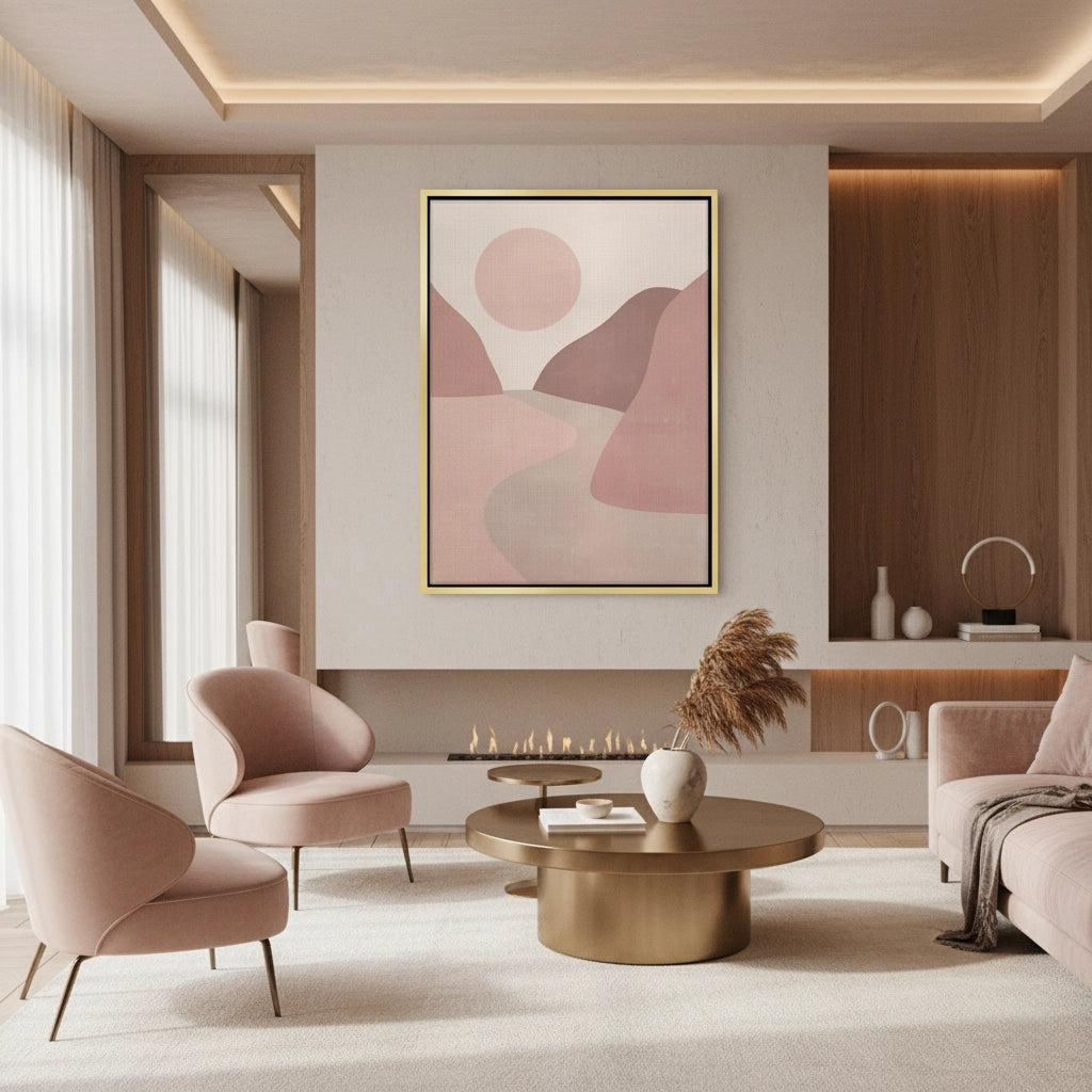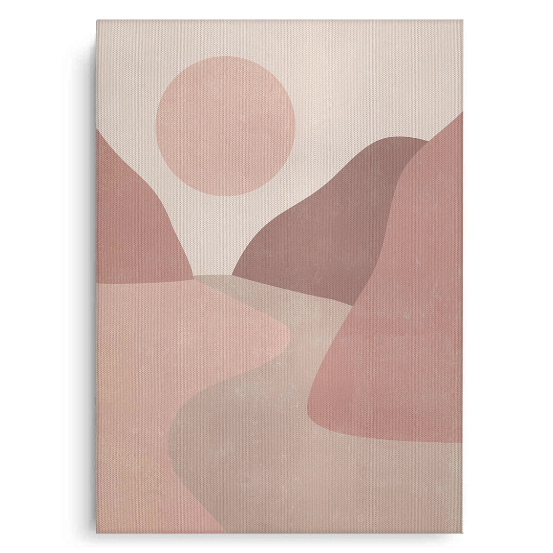 The tranquil Minimalist Mauve Sun and River print is a calming piece of abstract landscape art. This canvas features smoothly curved mountains and a serene river rendered in various tones of soft blush pink and mauve. The simple, geometric design and harmonious color palette evoke a sense of peace and natural beauty at sunrise or sunset. It is an excellent choice for adding a gentle, modern, and minimalist touch to any relaxing space in Dubai.