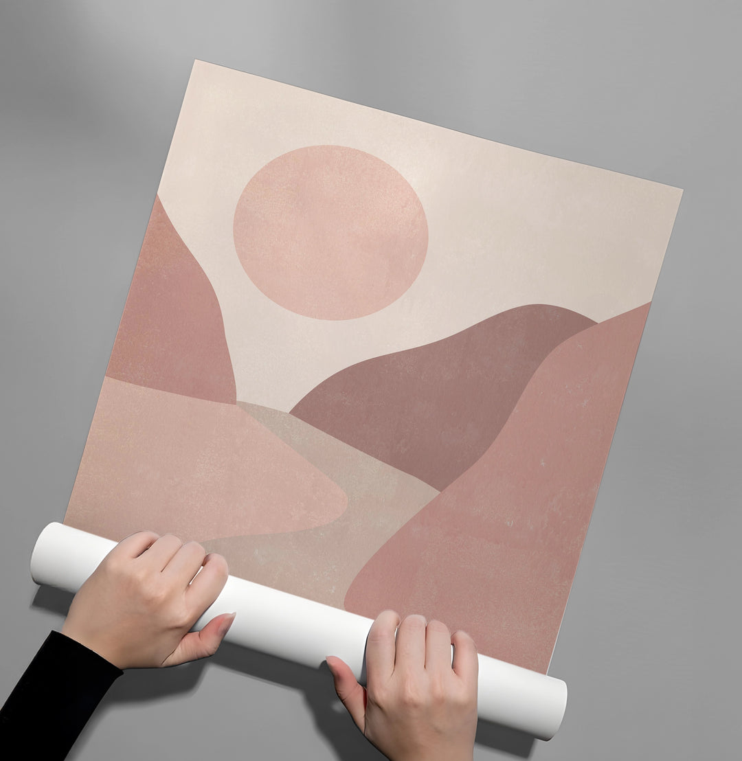 The tranquil Minimalist Mauve Sun and River print is a calming piece of abstract landscape art. This canvas features smoothly curved mountains and a serene river rendered in various tones of soft blush pink and mauve. The simple, geometric design and harmonious color palette evoke a sense of peace and natural beauty at sunrise or sunset. It is an excellent choice for adding a gentle, modern, and minimalist touch to any relaxing space in Dubai.