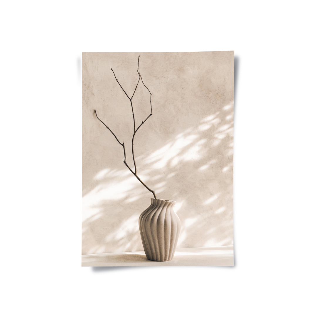 The tranquil Minimalist Neutral Ceramic Vase print is a striking piece of modern still life art. This canvas features a beautifully textured, ribbed ceramic vase holding a simple, dark, bare branch. Set against a soft, sunlit neutral background, the artwork uses light and shadow to create depth and serenity. It is an ideal piece for adding calming minimalist elegance and organic texture to any modern living space, bedroom, or entryway in Dubai.
