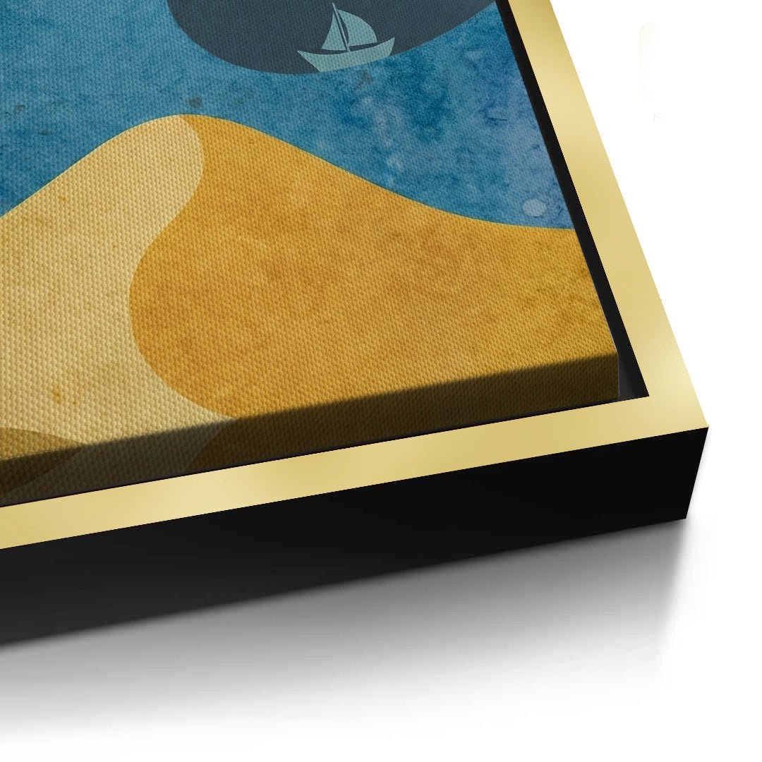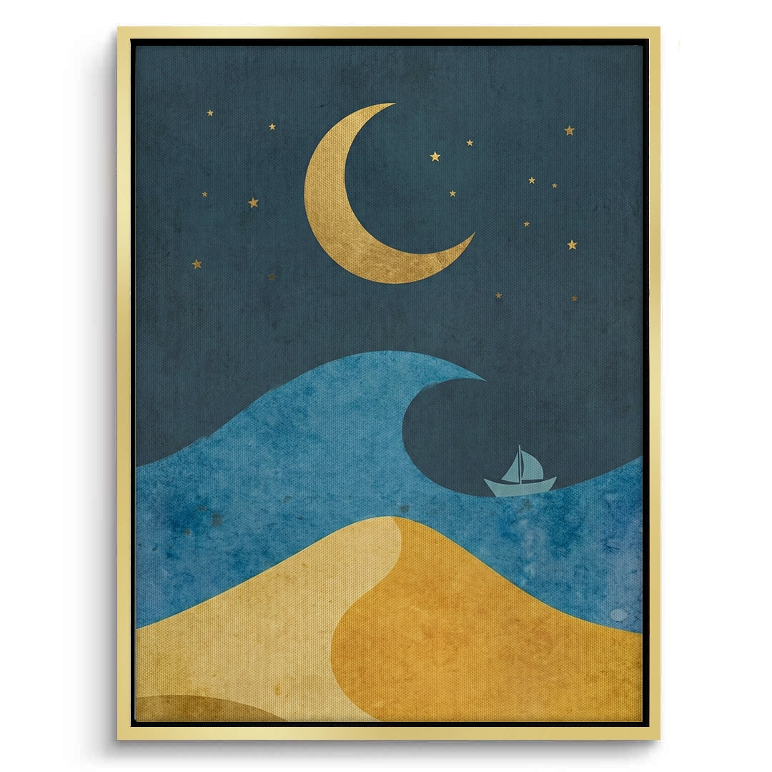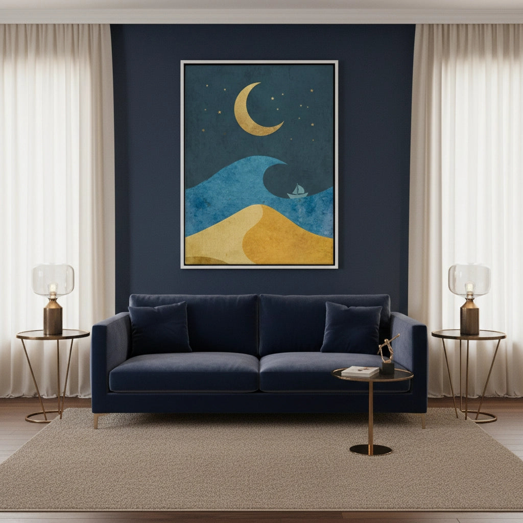 Drift into a world of wonder with the Minimalist Night Sky from Jasmine Art’s Bohemian series. This enchanting print captures a serene midnight scene, featuring a golden crescent moon and stars watching over a lone sailboat amidst rolling waves and desert dunes. Its deep indigo and gold palette brings a sense of mystery and peace to any modern space. Finished with our signature premium vertical texture, this print offers exceptional tactile depth and a high-end gallery finish. A perfect celestial accent for a quiet bedroom, a cozy nursery, or a modern study in Dubai.