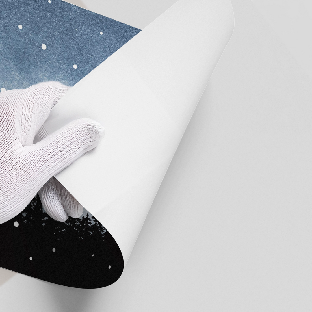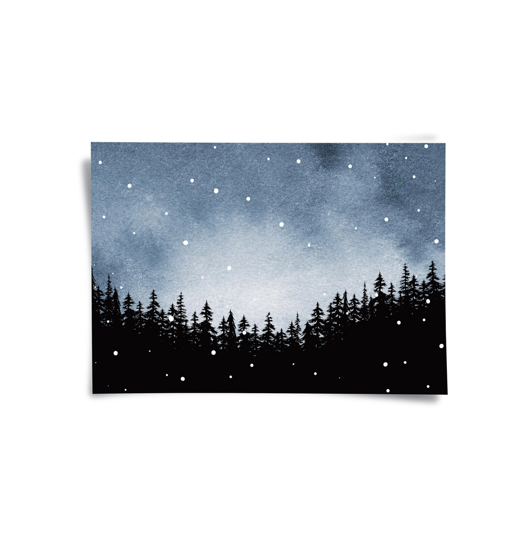 The tranquil Minimalist Pine Forest print captures the hushed beauty of a winter night. This canvas features a striking black silhouette of a dense pine tree line against a serene deep blue/grey watercolor sky. The scattered white dots evoke a gentle snowfall or a starlit night. This piece offers a calm, grounding, and elegantly moody aesthetic, ideal for adding natural sophistication and a sense of depth to a modern bedroom or study in Dubai.