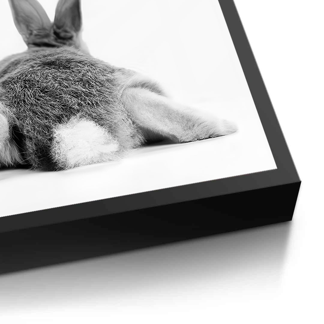 The endearing Minimalist Rabbit print offers a dose of playful charm for a modern nursery or child's room. This high-quality, monochrome photograph captures a rabbit in a charming rear-view pose, highlighting its soft fur, cute ears, and signature white tail patch. The simple black and white palette and uncluttered background ensure this piece is both chic and sweet. It is an ideal artwork for adding a subtle, stylish animal touch that grows with your child in Dubai.