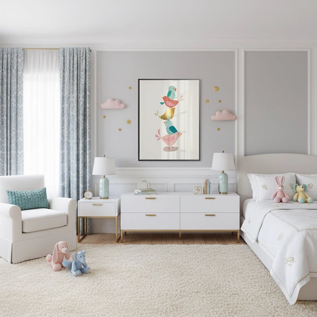 The adorable Minimalist Stacked Birds print is a charming and whimsical addition to any child’s space. This artwork features five cute, cartoon-style birds playfully stacked one atop the other. The birds are rendered in soft pastels (pink, mint, coral), with one dazzling bird highlighted in shimmering metallic gold foil. The simple design and luxurious touch make it perfect for adding subtle glamour and gentle playfulness to a modern nursery or playroom in Dubai.
