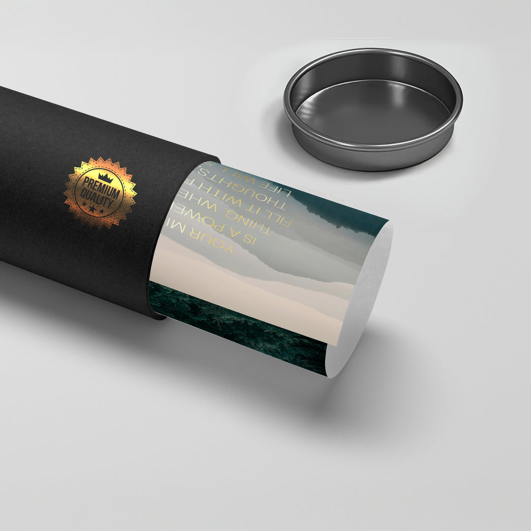 The inspiring Misty Mountain Landscape - Gold Motivational Typography print merges the tranquility of nature with powerful affirmation. The quote "YOUR MIND IS A POWERFUL THING. WHEN YOU FILL IT WITH POSITIVE THOUGHTS, YOUR LIFE WILL START TO CHANGE" is beautifully rendered in luminous metallic gold sans-serif typography. The text is layered over a breathtaking photograph of misty blue and green mountain ranges, creating an ethereal and calming atmosphere. This piece is perfect for promoting wellness, peace, and sophisticated motivation. Ideal for a tranquil bedroom, spa-like bathroom, or serene living area in Dubai.
