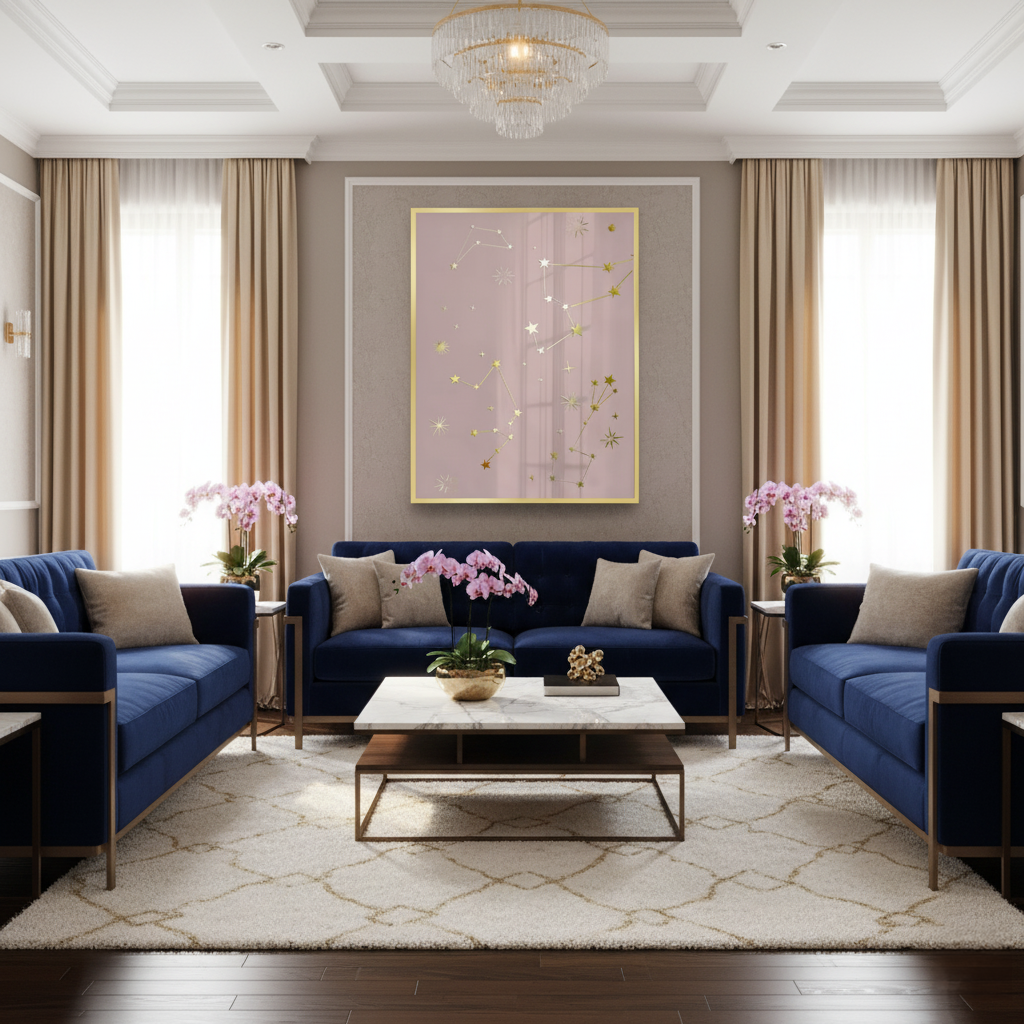 The Modern Celestial print captures the mystery of the cosmos with abstract shapes and deep, moody blues accented by brilliant, gold-flaked galaxies. This piece is a stunning focal point, ideal for adding a sense of wonder and luxurious abstract space art to a home library or entertainment room. Keywords: Modern Celestial Art, Abstract Space Decor, Gold Flakes, Moody Blue Canvas, Luxurious Cosmos.