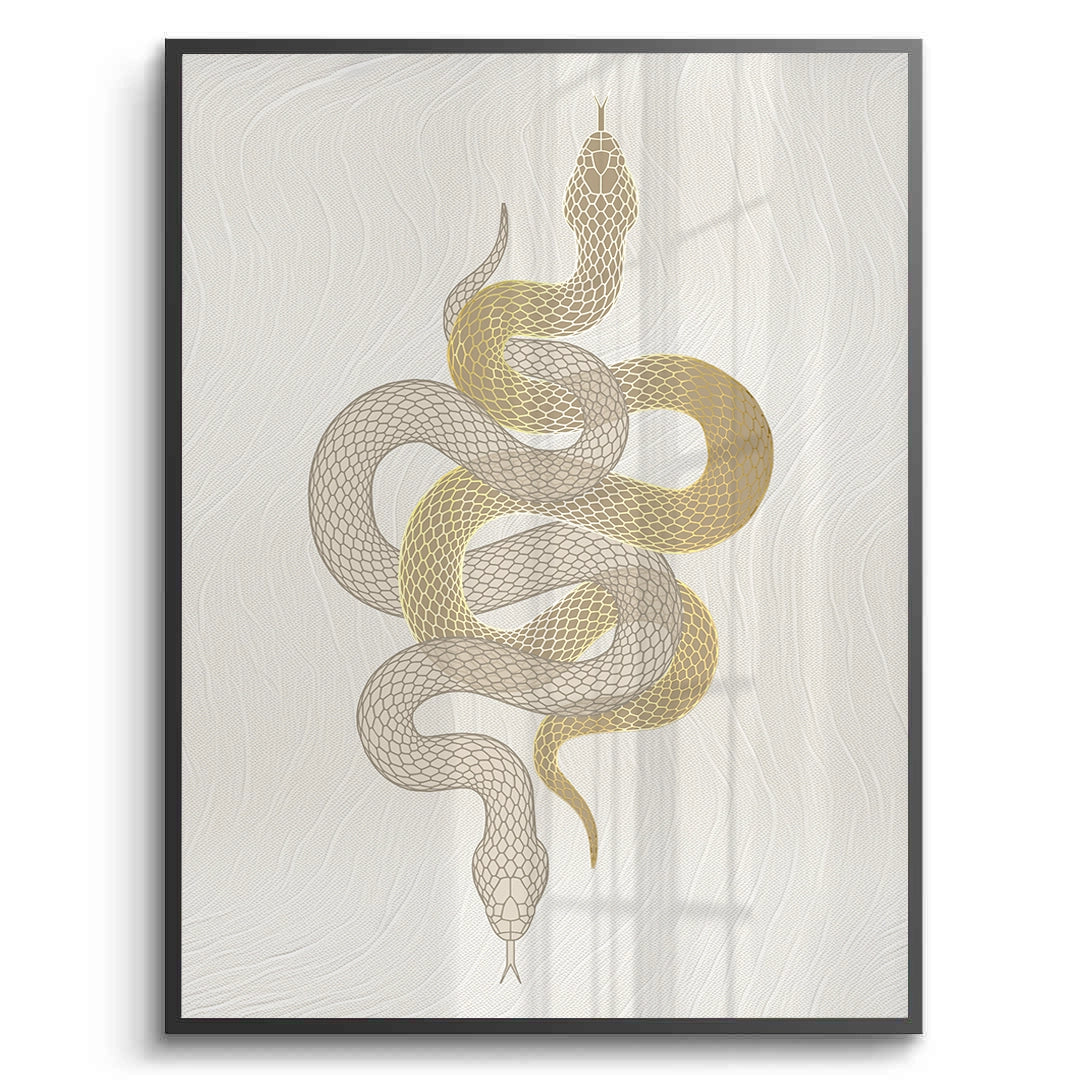 Embrace the allure of nature with the Modern Gold Python art print from Jasmine Art’s Bohemian series. This sophisticated piece features a symmetrical intertwining of two serpents, rendered in exquisite taupe and shimmering gold line-work. The intricate scale patterns symbolize balance and transformation, making it a meaningful addition to any space. Finished with our signature premium vertical texture, this minimalist design is elevated with luxurious tactile depth and a gallery-standard finish. A perfect chic statement for a modern master bedroom, luxury lounge, or a minimalist office in Dubai.