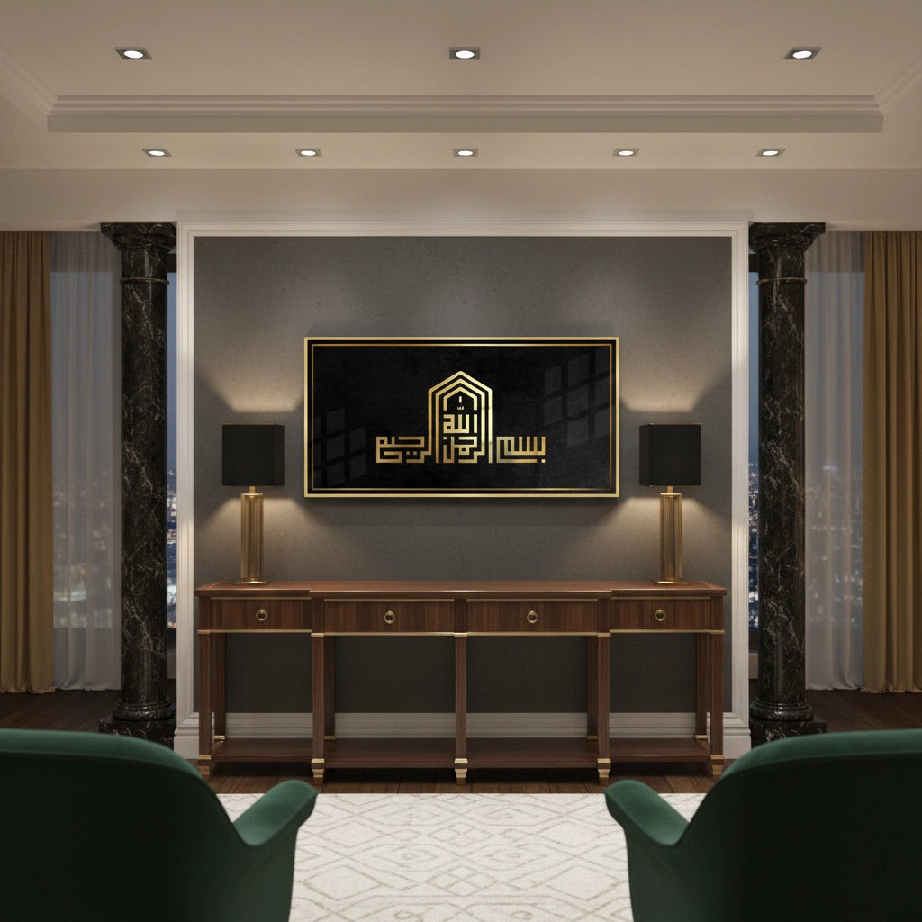 Elevate your home with the divine elegance of the Modern Kufic Bismillah from Jasmine Art’s Arabic Calligraphy collection. This masterful piece presents the "Bismillah" in a sophisticated geometric Kufic script, shaped into a stunning architectural arch. The striking contrast of radiant gold lettering against a rich, textured black background brings a regal and spiritual focal point to any modern space. Finished with our signature premium texture, this print offers exceptional tactile depth and a high-end gallery finish. A perfect spiritual accent for a formal Majlis, a luxury living room, or a welcoming entryway in Dubai.