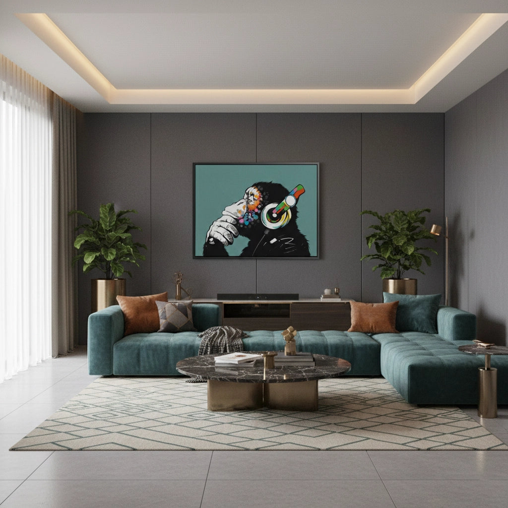 Make a bold statement with the Modern Thinking Chimp from Jasmine Art’s Banksy Artwork collection. This iconic street-art inspired piece features a contemplative chimpanzee with colorful headphones, blending gritty urban stencil style with vibrant pop-art accents. Its edgy composition and striking color contrast bring a modern, intellectual energy to any space. Finished with our signature premium vertical texture, this print offers exceptional tactile depth and a high-end gallery finish. A perfect centerpiece for a contemporary living room, a teen's studio, or a trendy office in Dubai.