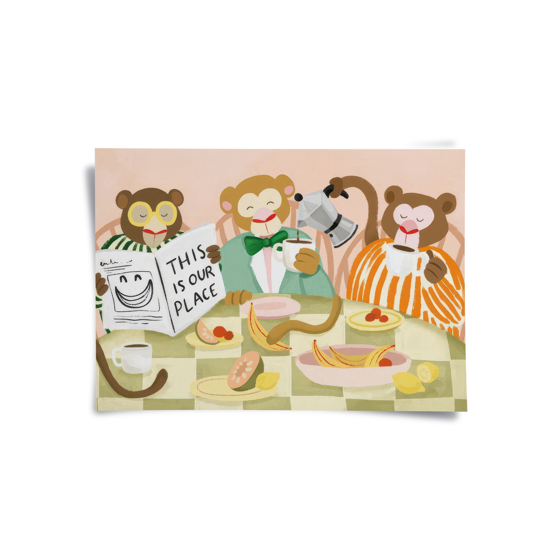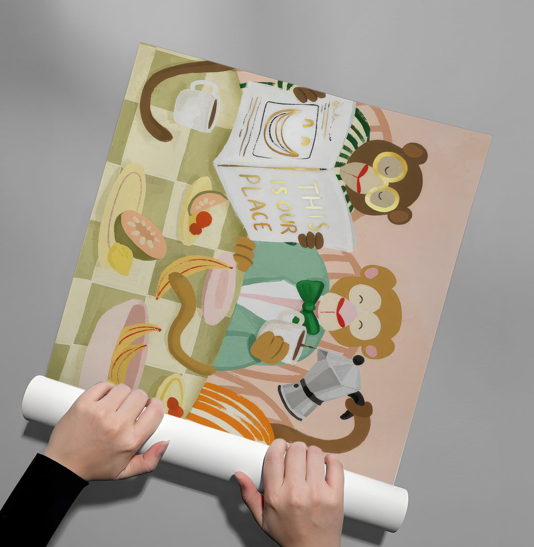 A fun and vibrant print depicting a cheeky monkey enjoying a comical breakfast scene. The Monkey Breakfast print is full of humor and life, making it a perfect, cheerful accent for a child's kitchen or dining area in the UAE.
