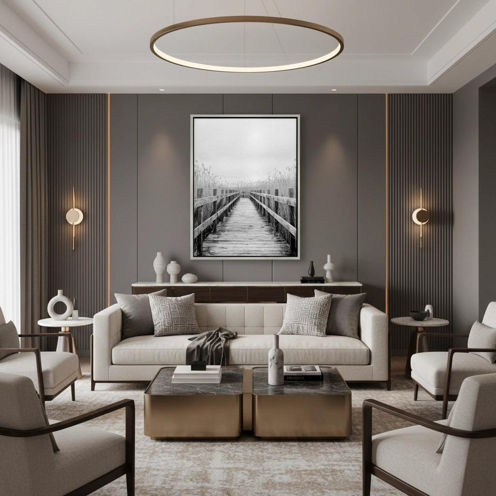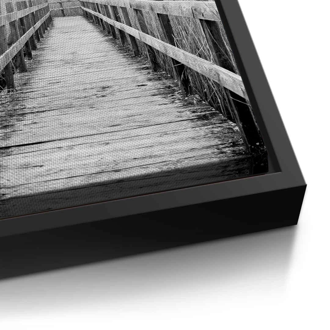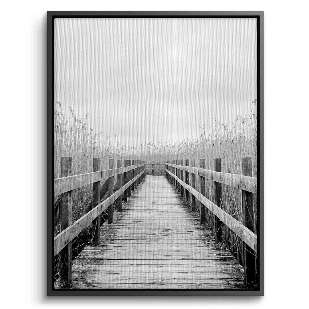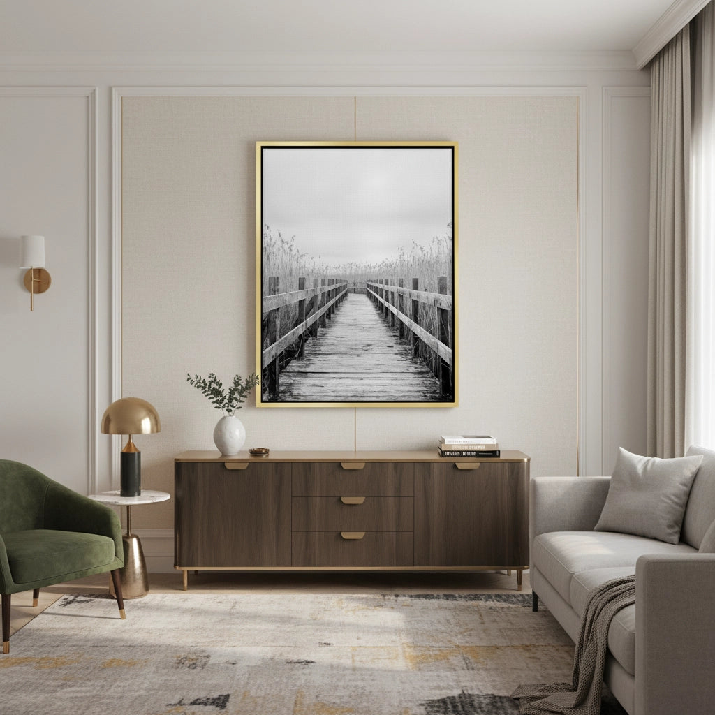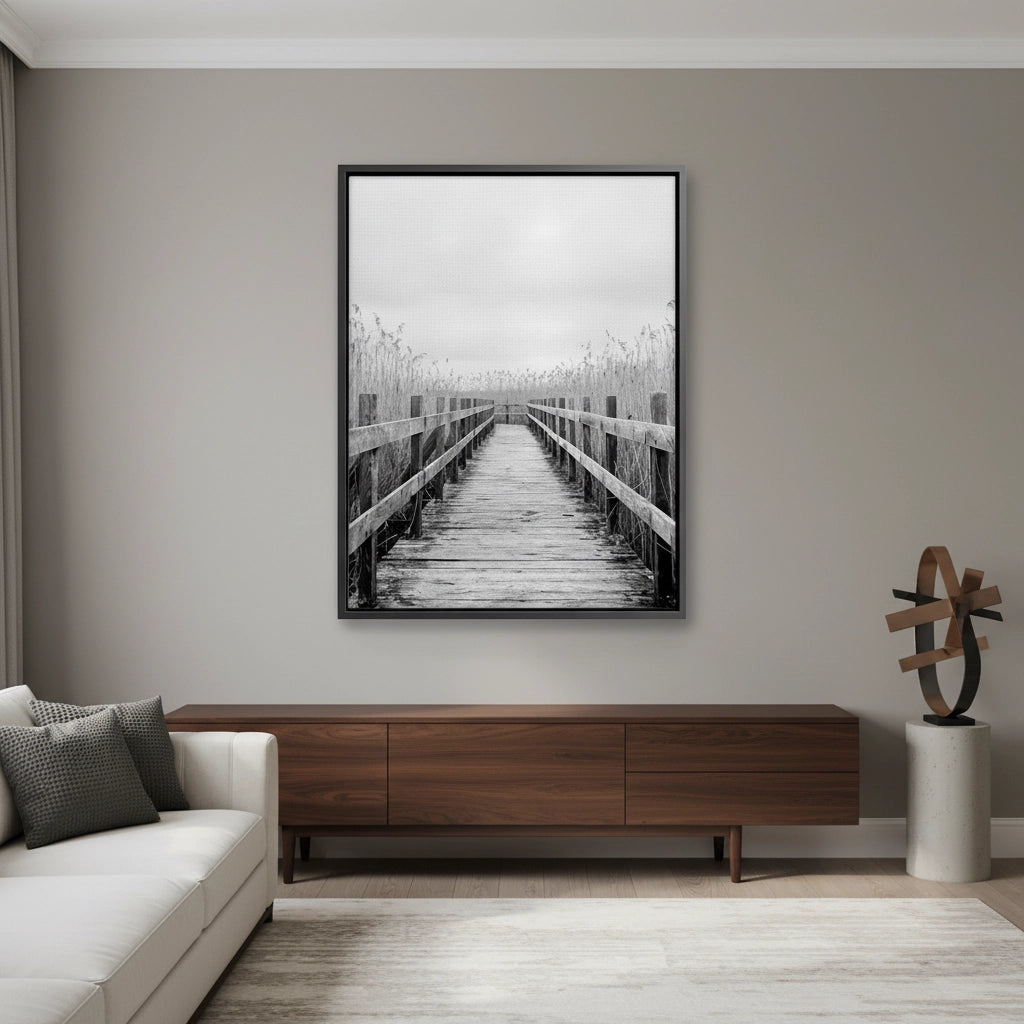 The contemplative Monochrome Boardwalk print captures the serene beauty of a wild marshland. This black and white photograph features a long, rustic wooden boardwalk bordered by tall, symmetrical dry reeds. The composition uses deep contrast and linear perspective to create a dramatic yet calming sense of depth and escape. It is an ideal piece for adding timeless elegance, natural texture, and moody sophistication to a modern living area or hallway in Dubai.