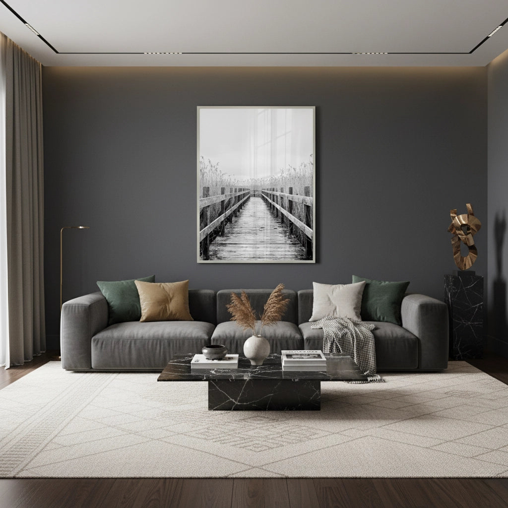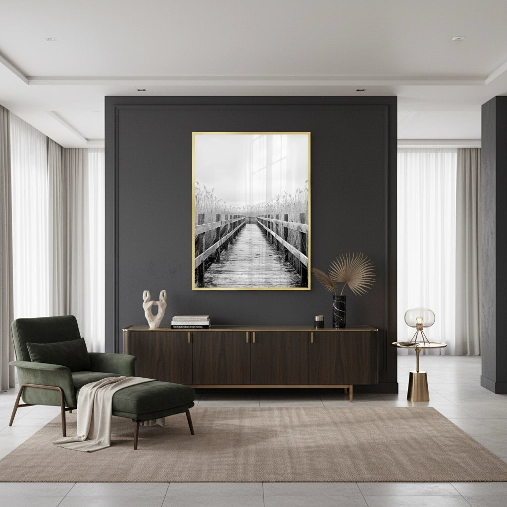 The contemplative Monochrome Boardwalk print captures the serene beauty of a wild marshland. This black and white photograph features a long, rustic wooden boardwalk bordered by tall, symmetrical dry reeds. The composition uses deep contrast and linear perspective to create a dramatic yet calming sense of depth and escape. It is an ideal piece for adding timeless elegance, natural texture, and moody sophistication to a modern living area or hallway in Dubai.