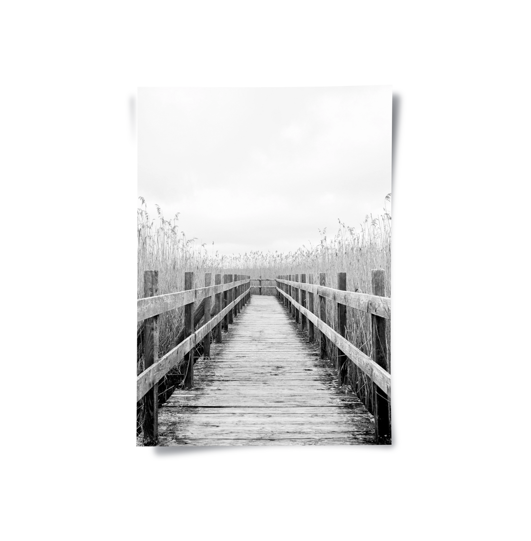 The contemplative Monochrome Boardwalk print captures the serene beauty of a wild marshland. This black and white photograph features a long, rustic wooden boardwalk bordered by tall, symmetrical dry reeds. The composition uses deep contrast and linear perspective to create a dramatic yet calming sense of depth and escape. It is an ideal piece for adding timeless elegance, natural texture, and moody sophistication to a modern living area or hallway in Dubai.