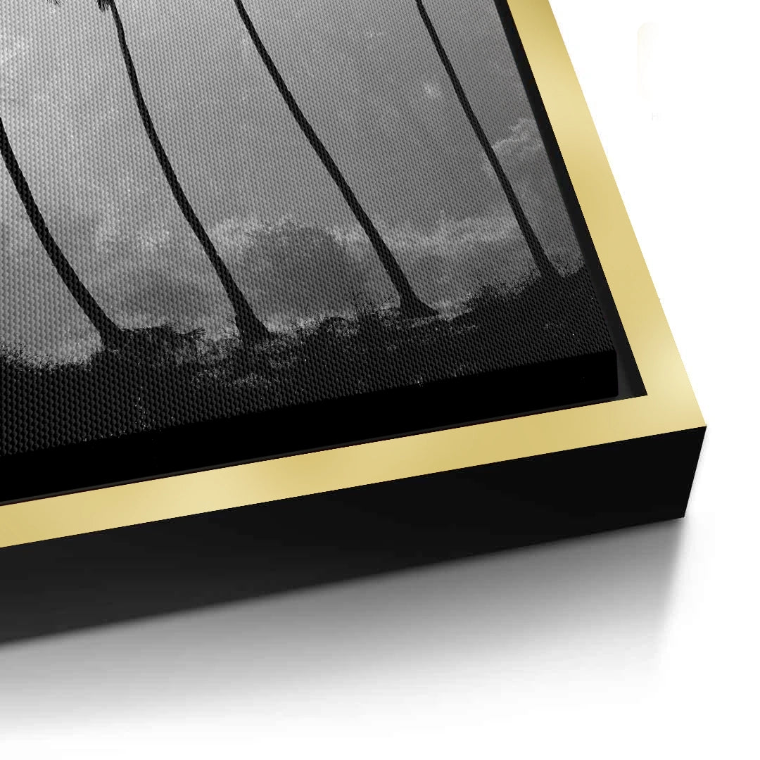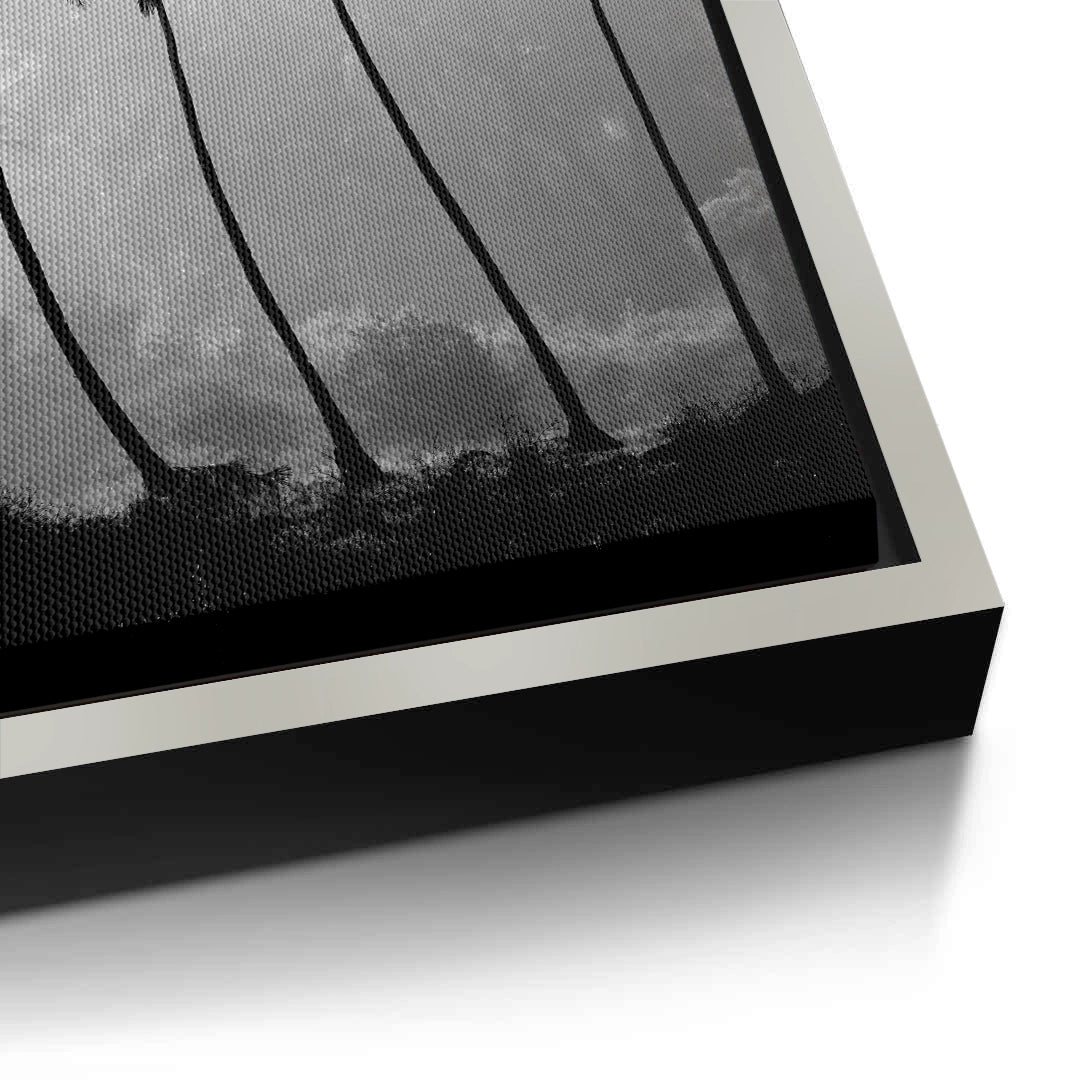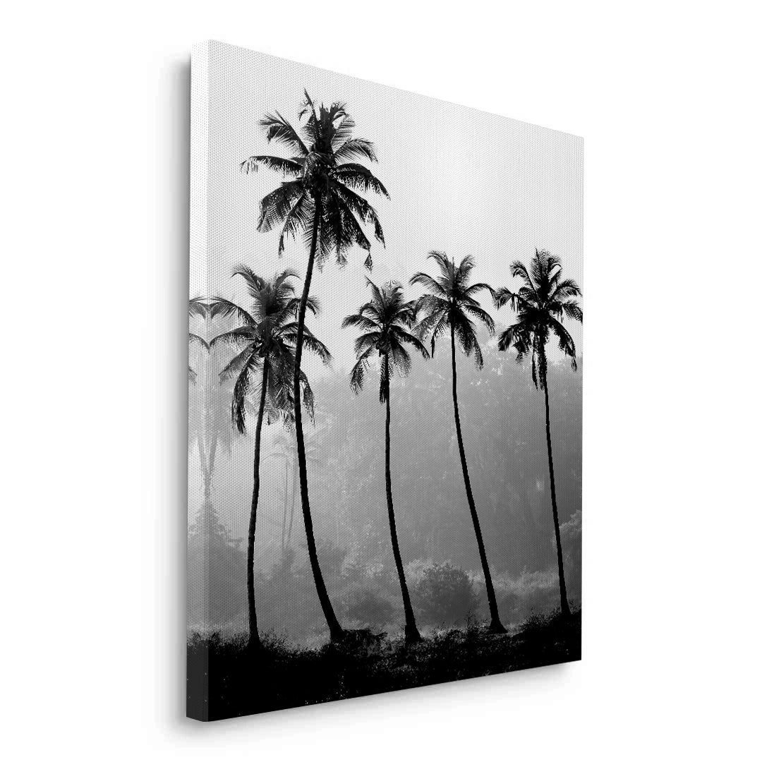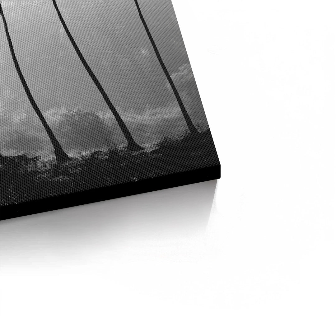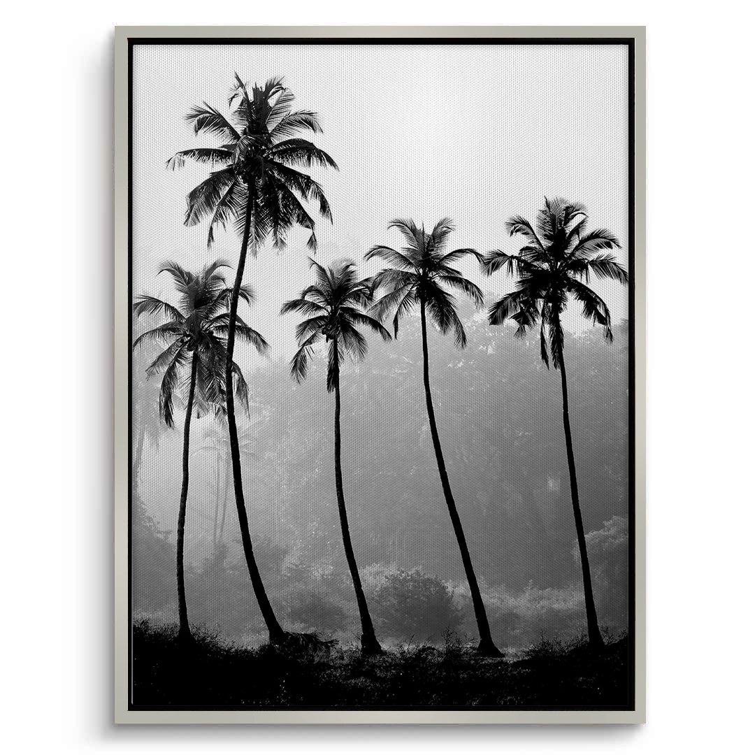 The dramatic Monochrome Palm Silhouette print captures the iconic elegance of tropical trees in striking black and white. This photograph features five tall palm trees standing in dark silhouette against a luminous, hazy background. The contrast between the sharp lines of the palms and the soft, foggy light creates a moody, sophisticated, and deeply evocative tropical scene. It is a powerful piece ideal for injecting timeless, high-contrast tropical style into a modern living area or lounge in Dubai.