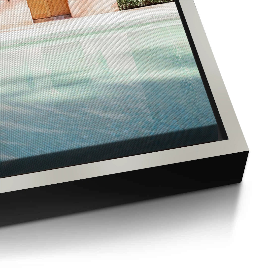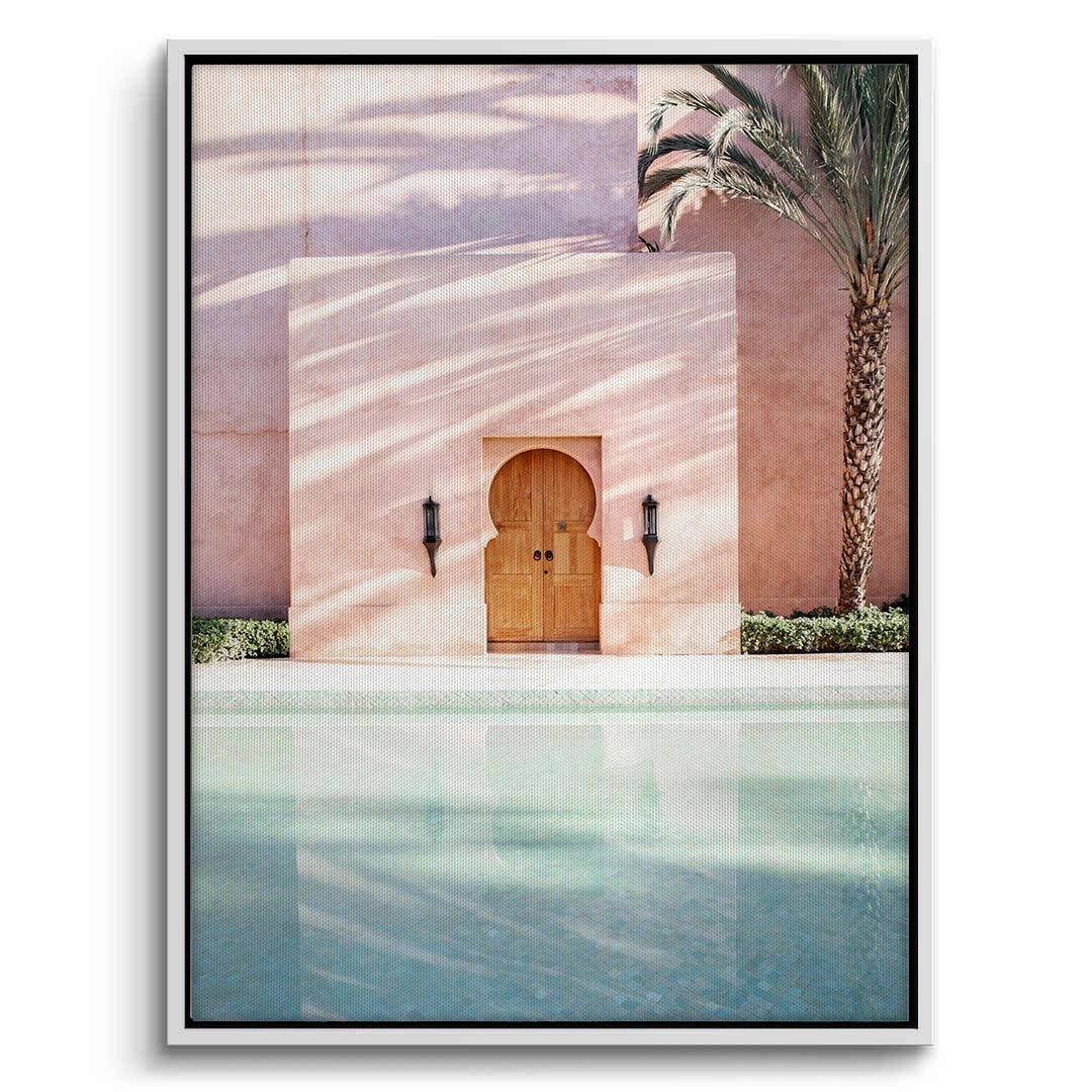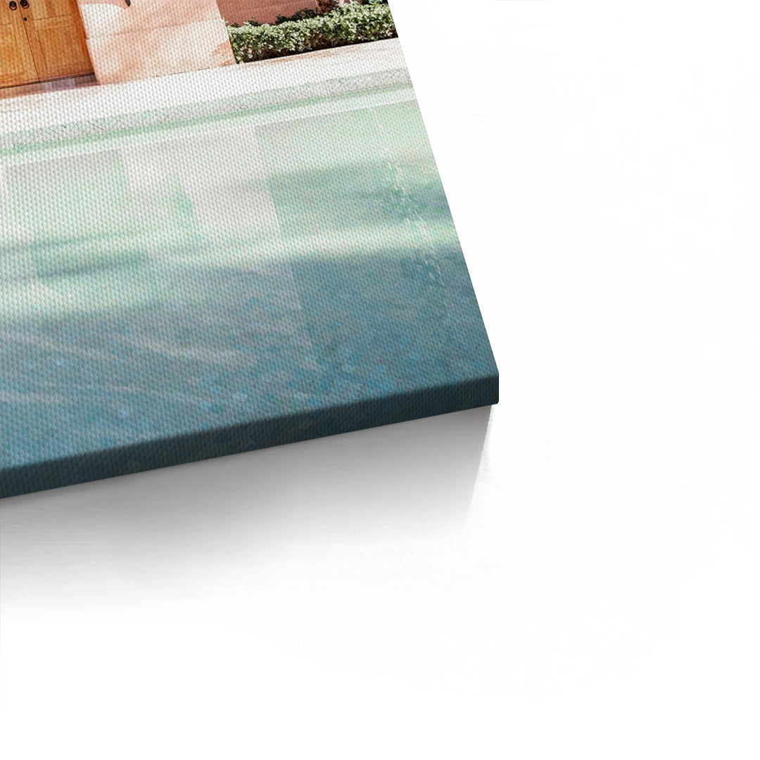 The exquisite Moroccan Pink Wall print captures the serene luxury and architectural beauty of a high-end Arabian resort. This canvas features a striking visual contrast between the soft pink, textured wall with its arched wooden doorway, and the tranquil turquoise pool below. Perfect for invoking a feeling of exotic relaxation and designer luxury, this piece is an exceptional statement for a sophisticated living space or boutique hotel lobby in Dubai.