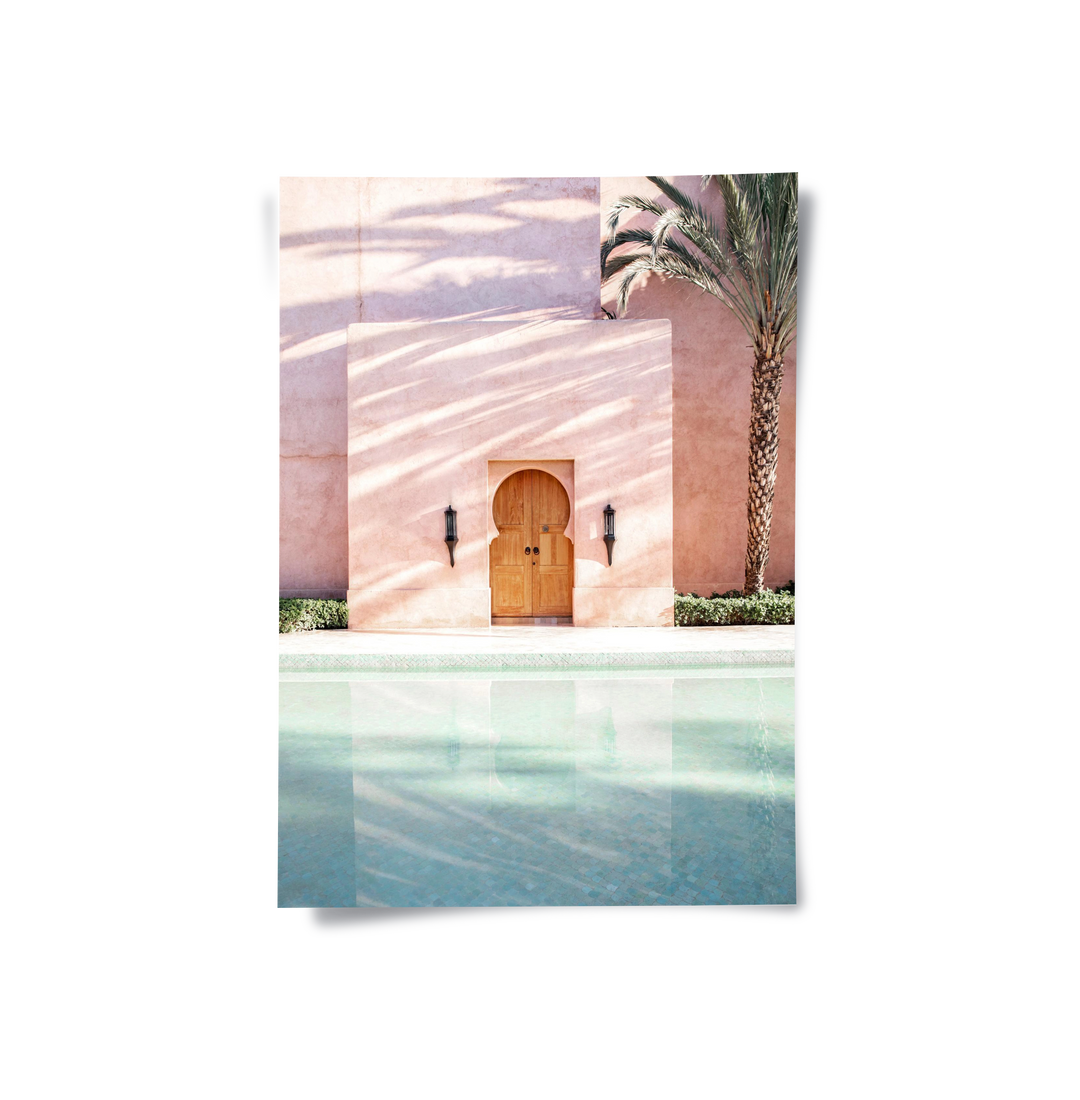 The exquisite Moroccan Pink Wall print captures the serene luxury and architectural beauty of a high-end Arabian resort. This canvas features a striking visual contrast between the soft pink, textured wall with its arched wooden doorway, and the tranquil turquoise pool below. Perfect for invoking a feeling of exotic relaxation and designer luxury, this piece is an exceptional statement for a sophisticated living space or boutique hotel lobby in Dubai.