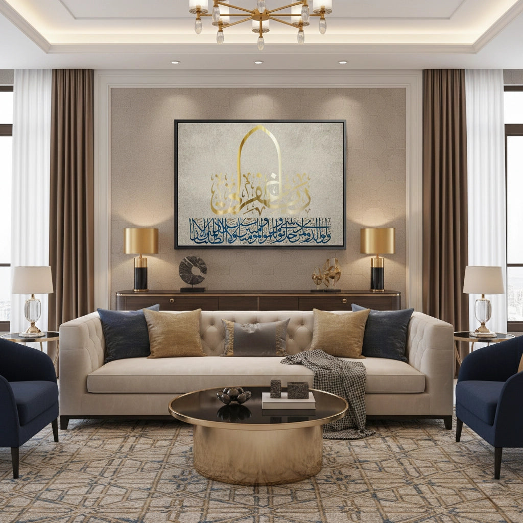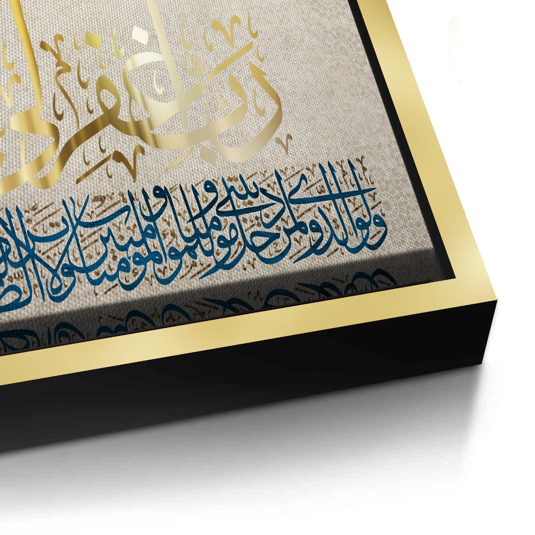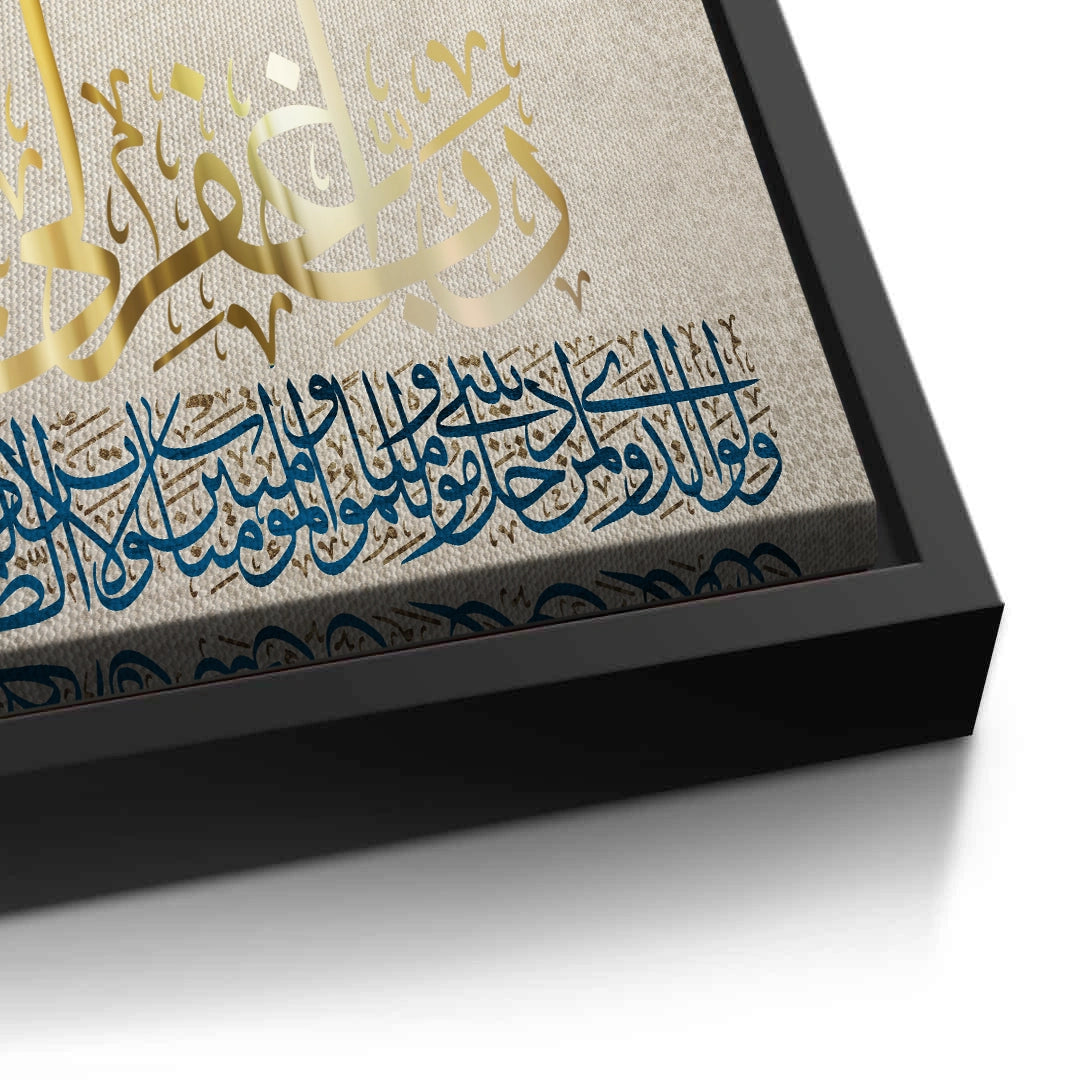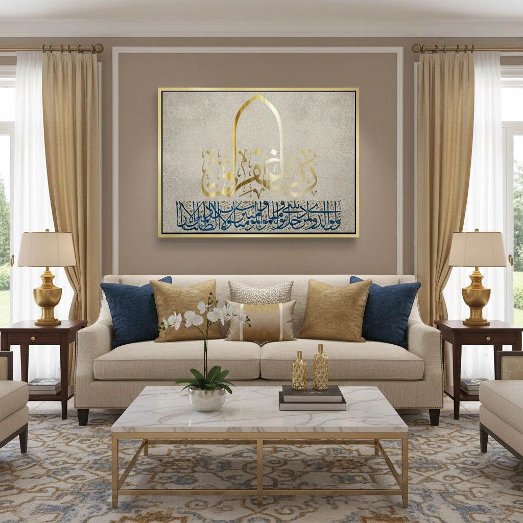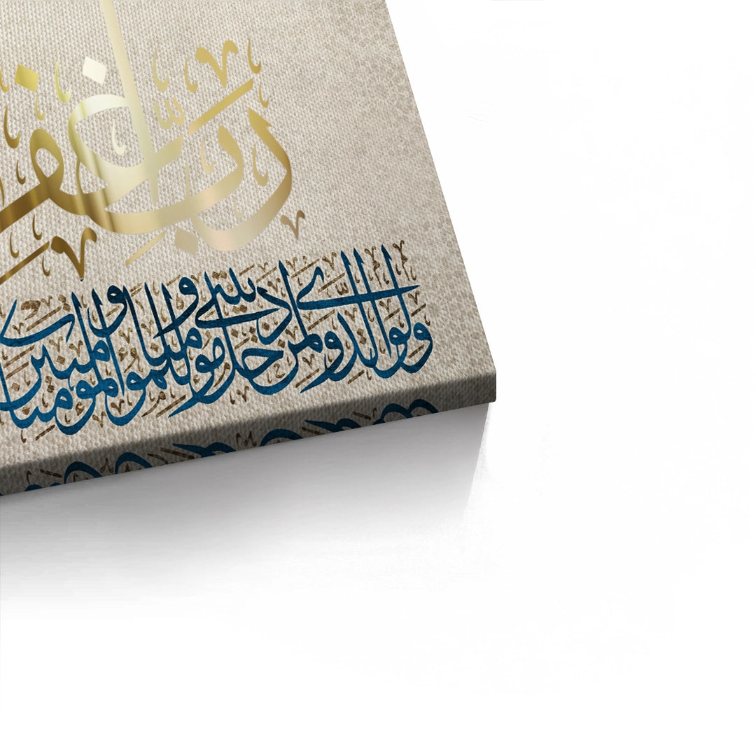 Seek divine forgiveness with the My Lord, Forgive Me masterpiece from Jasmine Art’s Arabic Calligraphy collection. This striking artwork features the prayer "Rabbi Ighfir Li" rendered in a radiant golden arched script, symbolizing the gateway to mercy. The base features detailed indigo blue calligraphy set against a textured, mandala-patterned cream backdrop. Finished with our signature premium grain texture, this print offers exceptional tactile depth and a luxury gallery finish. An ideal spiritual anchor for a prayer room, a peaceful bedroom, or a formal Majlis in Dubai.
