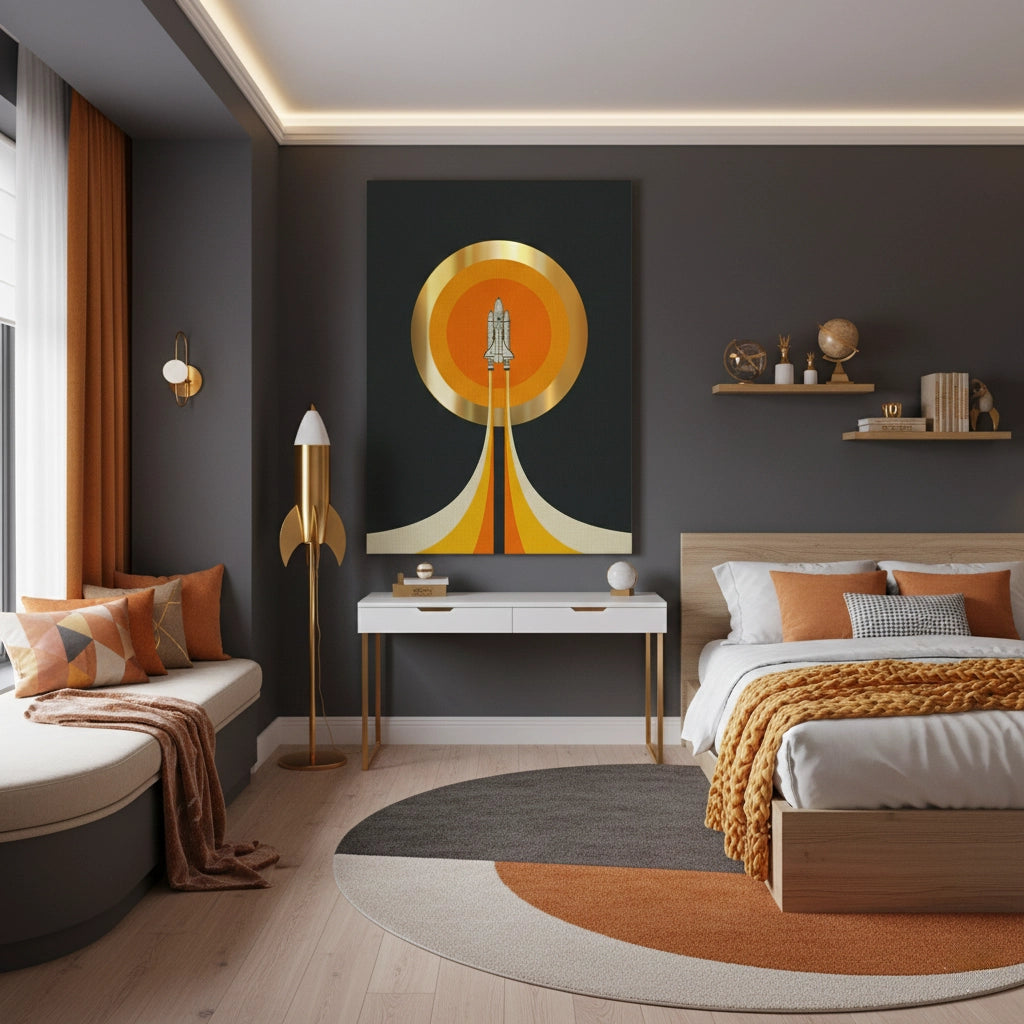 The dynamic NASA Inspired Rocket Ship print is a striking piece that captures the excitement and ambition of space exploration. This retro-styled illustration features a detailed Space Shuttle blasting off, framed by a luminous metallic gold foil sun or planet. The bold, sweeping lines of the exhaust trail add a classic, adventurous feel. Perfect for inspiring dreams of science and adventure, this artwork adds a cool, futuristic, and motivational statement to a child’s room or playroom in Dubai.