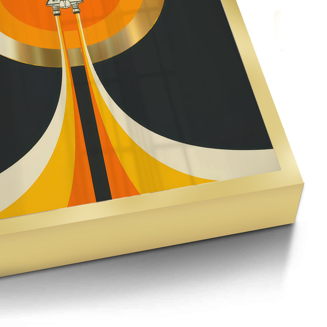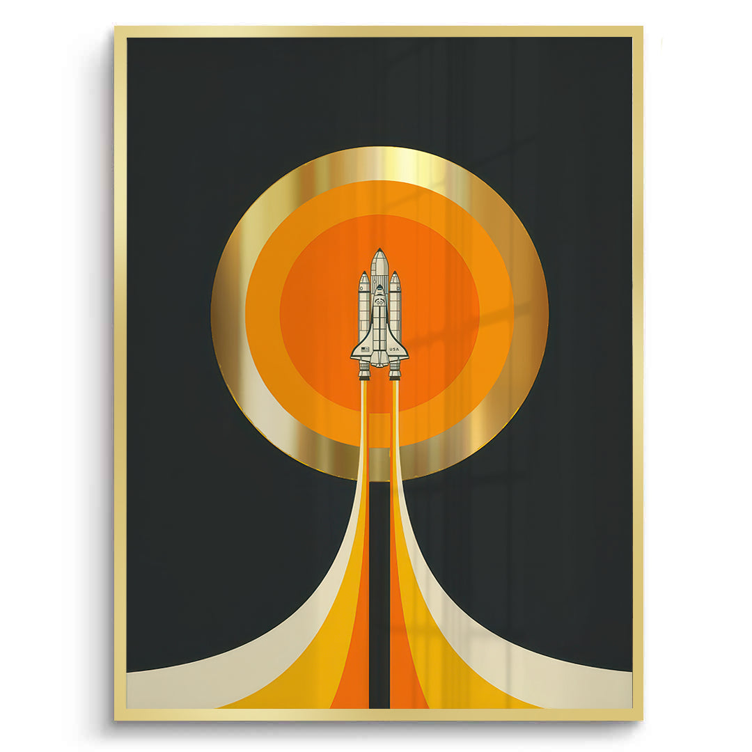 The dynamic NASA Inspired Rocket Ship print is a striking piece that captures the excitement and ambition of space exploration. This retro-styled illustration features a detailed Space Shuttle blasting off, framed by a luminous metallic gold foil sun or planet. The bold, sweeping lines of the exhaust trail add a classic, adventurous feel. Perfect for inspiring dreams of science and adventure, this artwork adds a cool, futuristic, and motivational statement to a child’s room or playroom in Dubai.