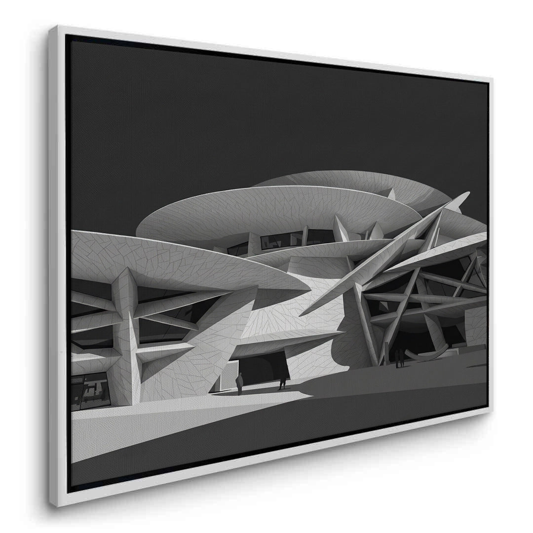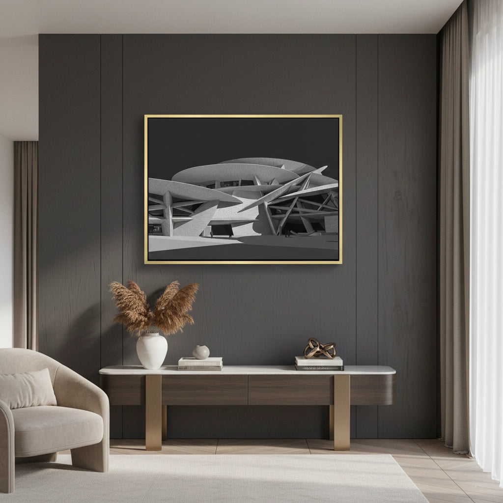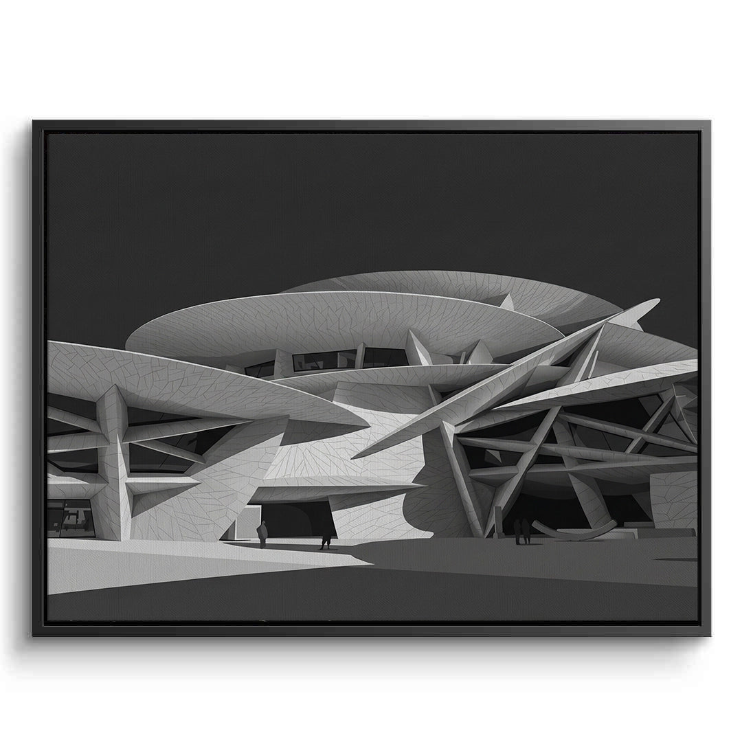 The striking National Museum of Qatar - Desert Rose Monochrome print is a masterpiece of modern structural art. Capturing the avant-garde 'Desert Rose' design, this artwork features the museum’s iconic interlocking discs and sharp, geometric angles in a dramatic black and white palette. The high-contrast monochrome style emphasizes the intricate textures and the cinematic interplay of light and shadow across the futuristic facade. A celebration of Qatari identity and global architectural innovation, this sophisticated piece is a perfect focal point for a contemporary office, a minimalist gallery wall, or a luxury living space in Dubai or Doha.