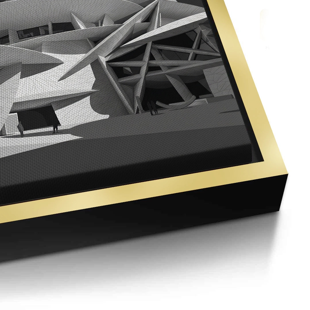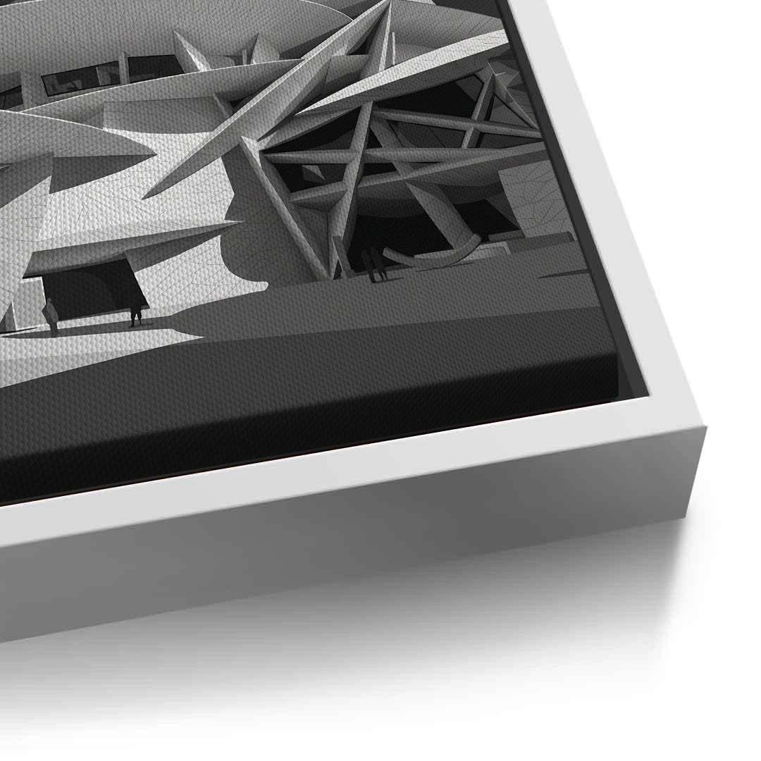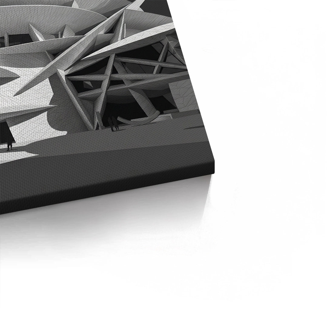 The striking National Museum of Qatar - Desert Rose Monochrome print is a masterpiece of modern structural art. Capturing the avant-garde 'Desert Rose' design, this artwork features the museum’s iconic interlocking discs and sharp, geometric angles in a dramatic black and white palette. The high-contrast monochrome style emphasizes the intricate textures and the cinematic interplay of light and shadow across the futuristic facade. A celebration of Qatari identity and global architectural innovation, this sophisticated piece is a perfect focal point for a contemporary office, a minimalist gallery wall, or a luxury living space in Dubai or Doha.