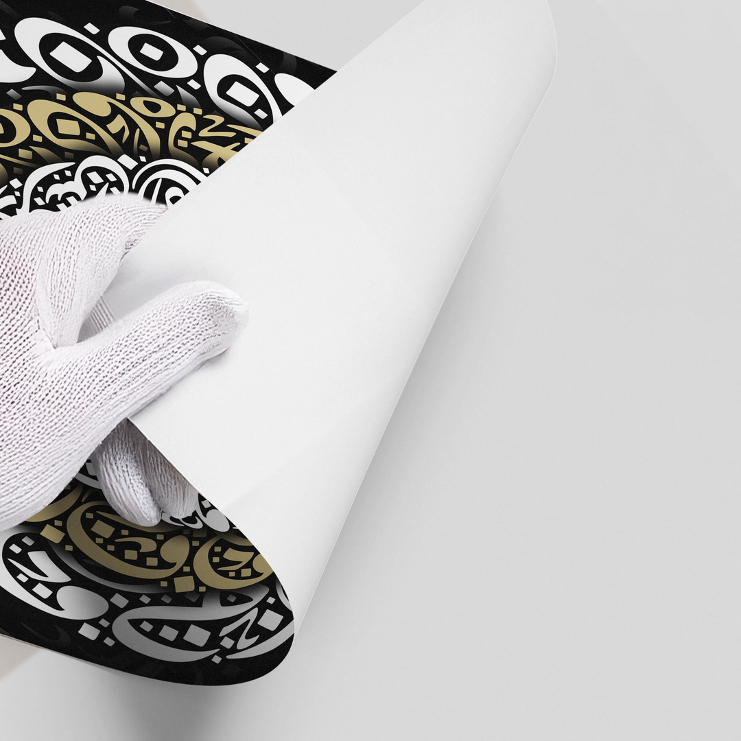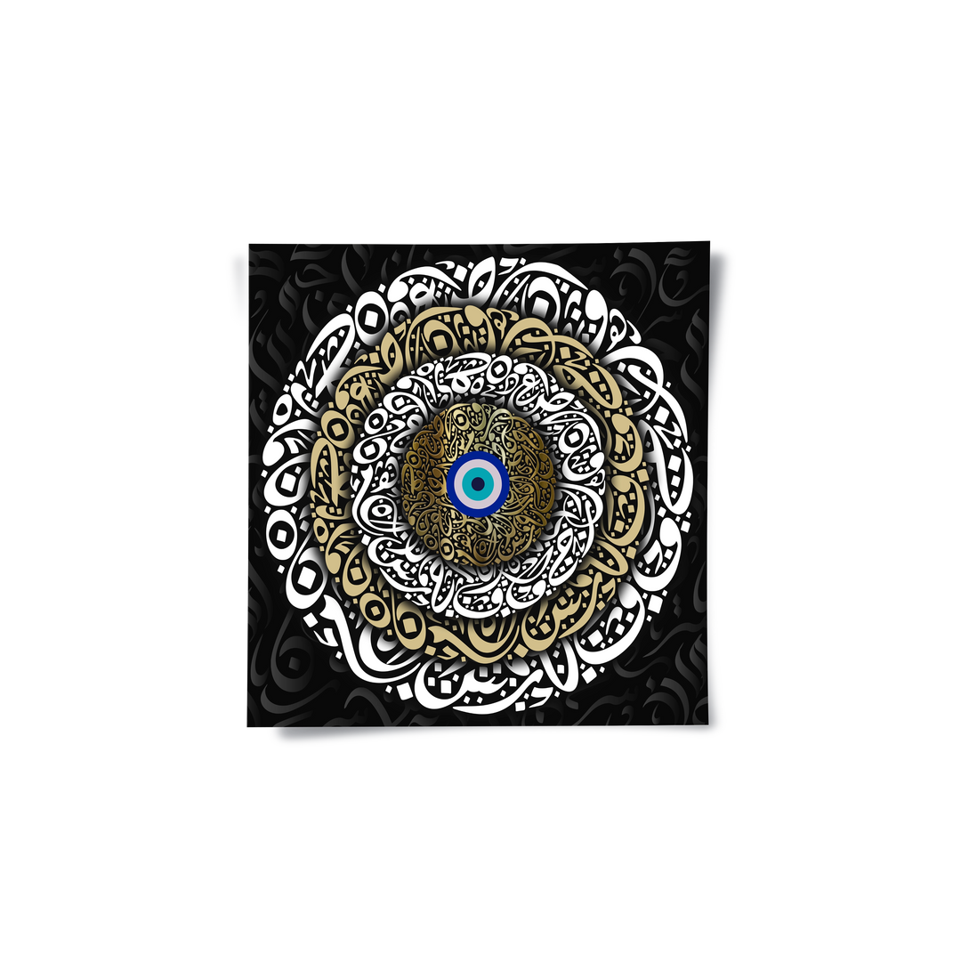 The intricate Nazar Eye - Gold Calligraphy Protection print is a stunning piece steeped in spiritual symbolism. The design features a central, vibrant Nazar Boncuk (Evil Eye) motif, surrounded by concentric, highly detailed rings of Arabic calligraphy. These layers utilize a rich blend of metallic gold, white, and black script to create a dense, protective mandala-like pattern. Set against a deep black background, this artwork is a luxurious and sophisticated statement piece. Ideal for attracting positive energy and adding opulent, culturally rich décor to a home or business in Dubai.