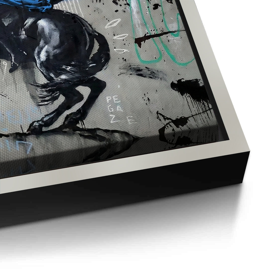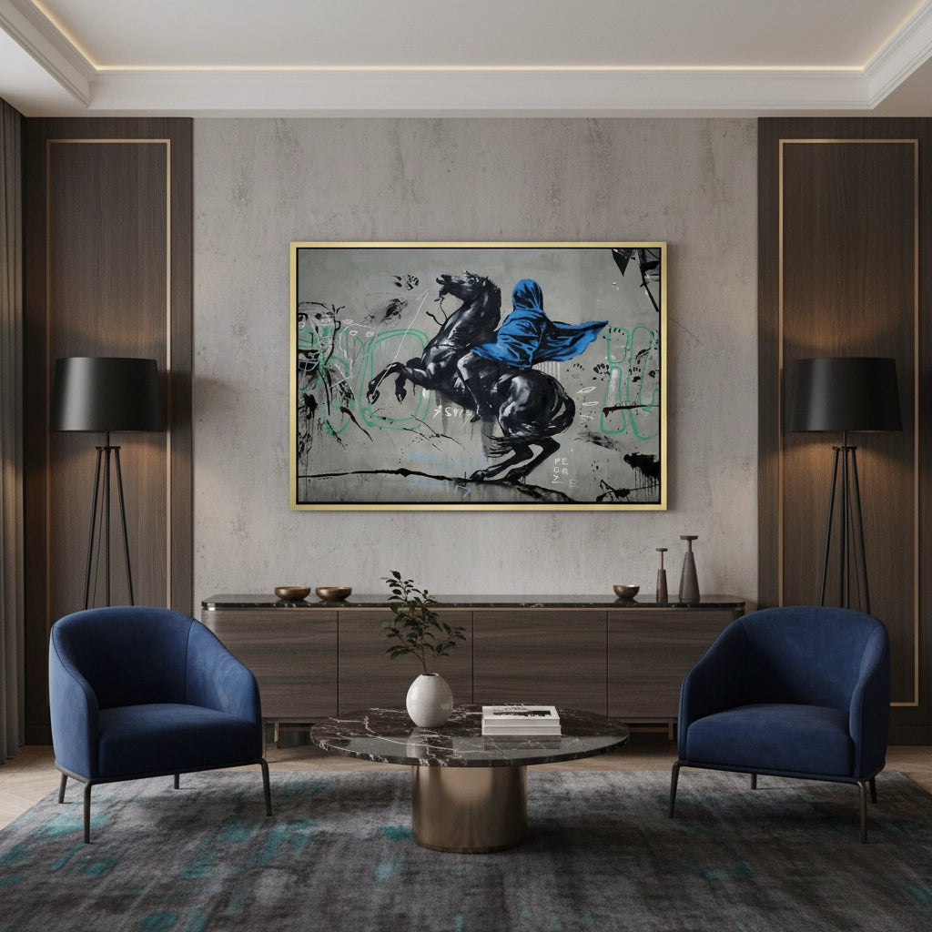 Redefine power and history with the Neo-Expressionist Napoleon from Jasmine Art’s Banksy-inspired collection. This masterpiece reimagines the iconic equestrian portrait with a mysterious rider draped in vibrant electric blue, set against a raw, Basquiat-style graffiti background. The bold contrast of the monochromatic horse and the striking blue cloak creates a high-impact visual statement. Finished with our signature premium vertical texture, this print elevates urban street culture into a luxury decorative centerpiece. A perfect bold addition for a sophisticated study, a modern gallery wall, or a luxury loft in Dubai.