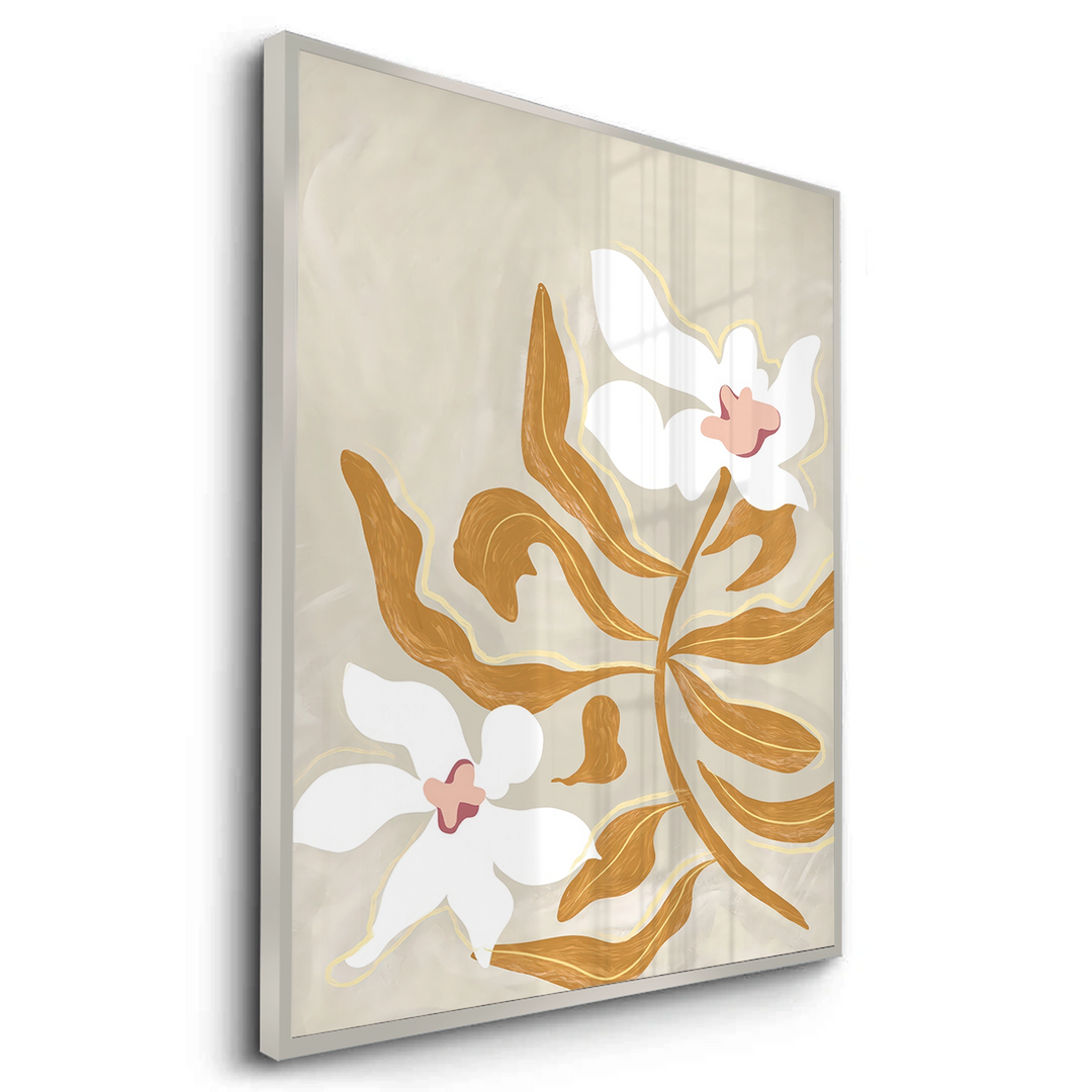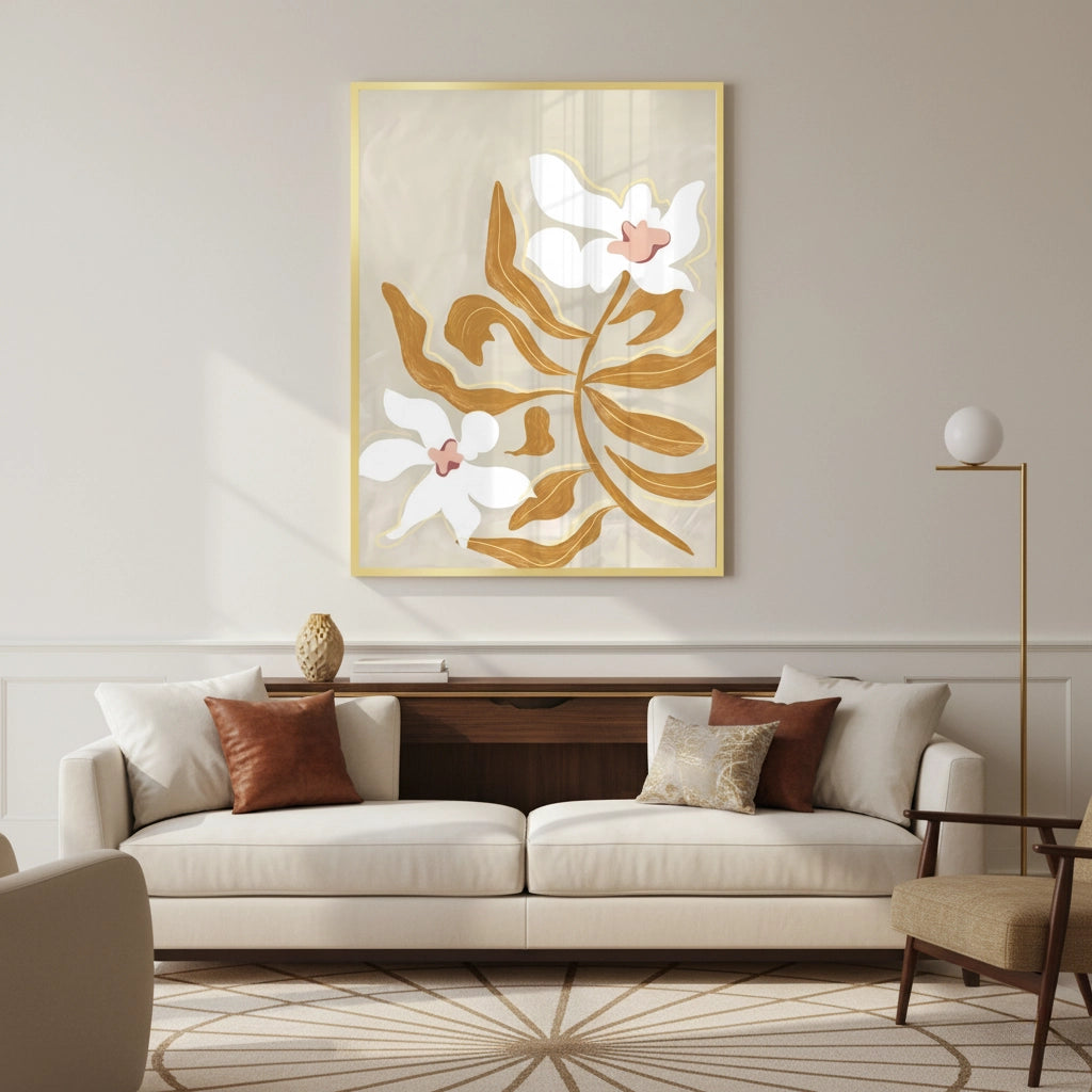 The serene Neutral Earth Tone Floral print is a perfect piece of modern bohemian art. This canvas features large, stylized white blooms and sweeping leaves rendered in a warm, earthy terracotta/brown palette. The overall look is calming and sophisticated, thanks to the soft, neutral beige backdrop. It is an ideal choice for bringing a natural, organic, and peaceful vibe to a contemporary living room, bedroom, or lounge area in Dubai.