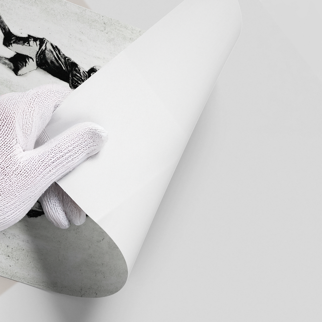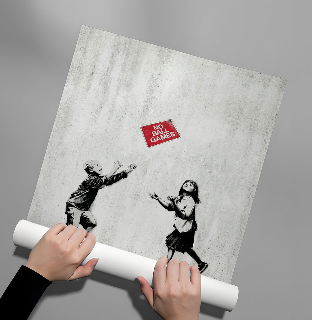 Celebrate the spirit of childhood rebellion with the No Ball Games art print from Jasmine Art’s Banksy series. This iconic piece features two children playfully tossing a restrictive "No Ball Games" sign, turning authority into a game. The gritty, monochromatic stencil work is brilliantly contrasted by the singular pop of red from the sign. Finished with our signature premium vertical texture, this print elevates provocative street commentary into a luxury decorative masterpiece. A bold and witty addition for a modern hallway, play area, or creative office in Dubai.