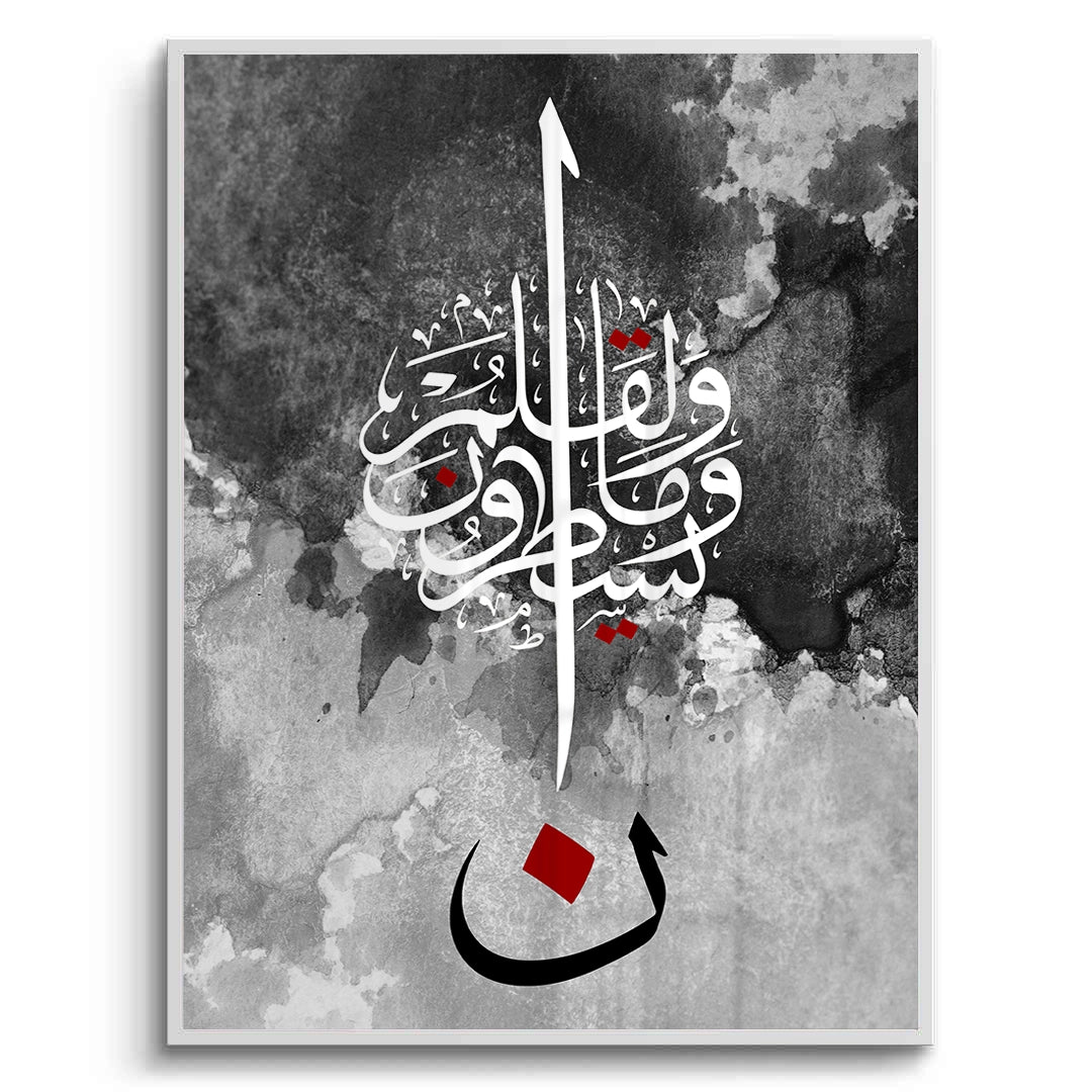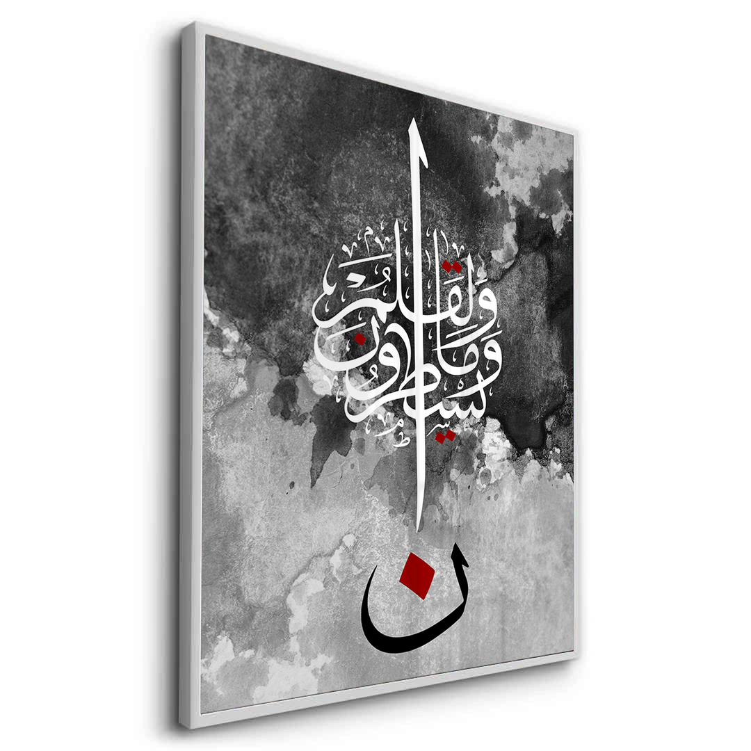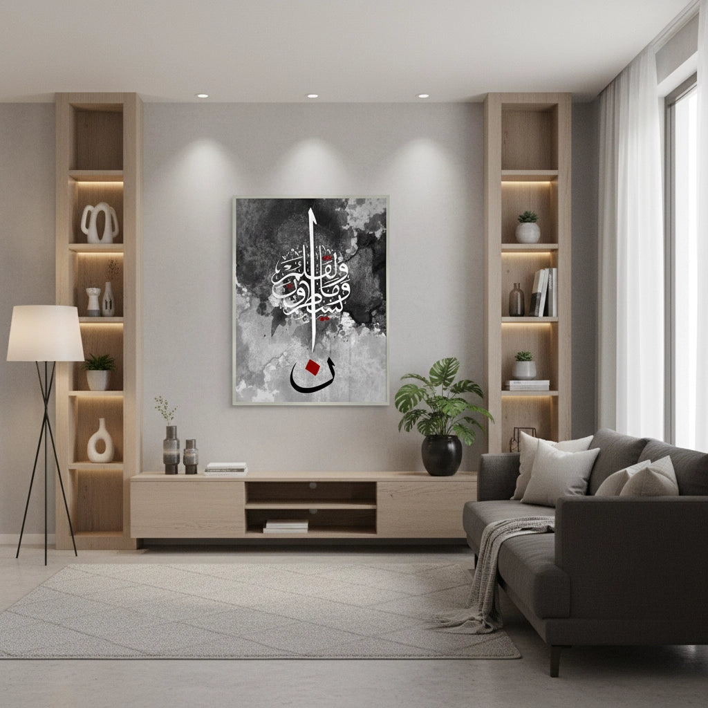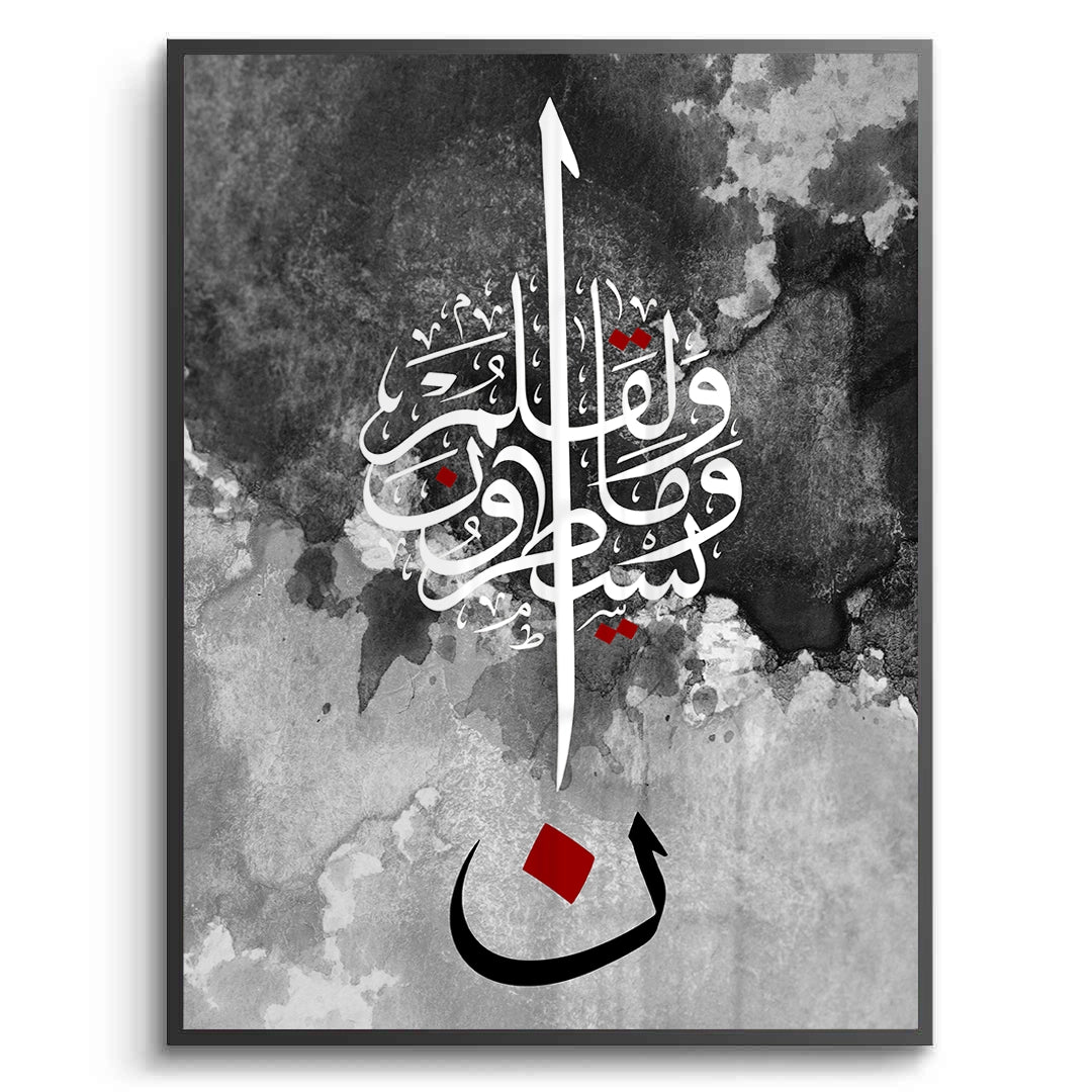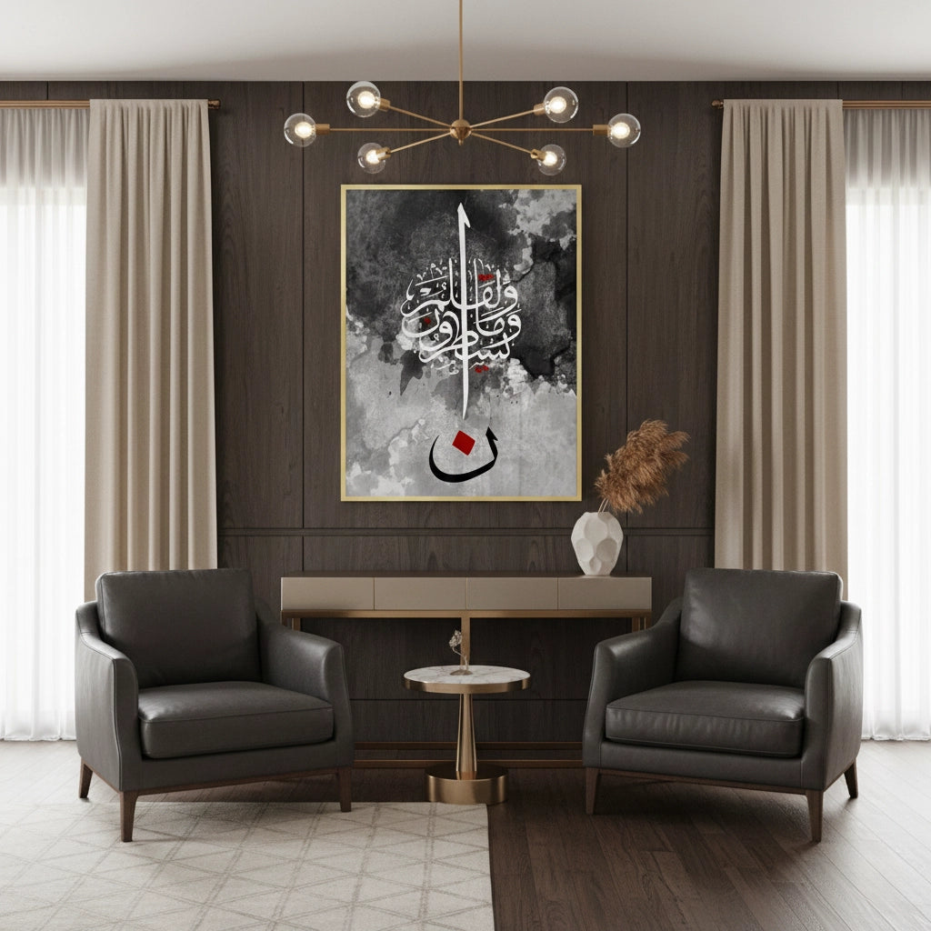 The striking Nūn & The Pen - Abstract Calligraphy print is a powerful, modern piece inspired by Quranic themes, particularly the letter Nūn and the Surah Al-Qalam (The Pen). This high-contrast artwork features intricate white Arabic script against a textural black and grey watercolor background. The composition is anchored by a large, bold black letter 'Nūn' (ن) with a central red accent, creating a dramatic and profound focal point. Ideal for adding a modern, deep, and artistic spiritual statement to a study or living area in Dubai.