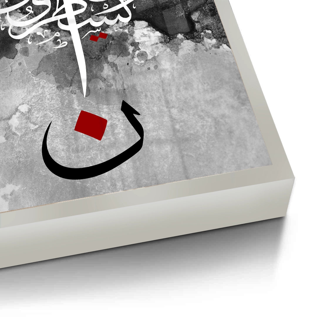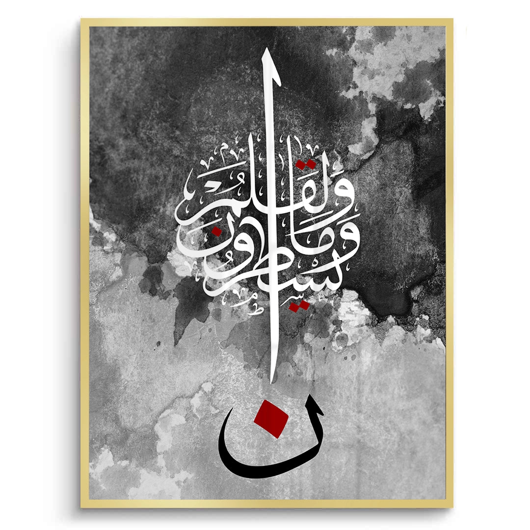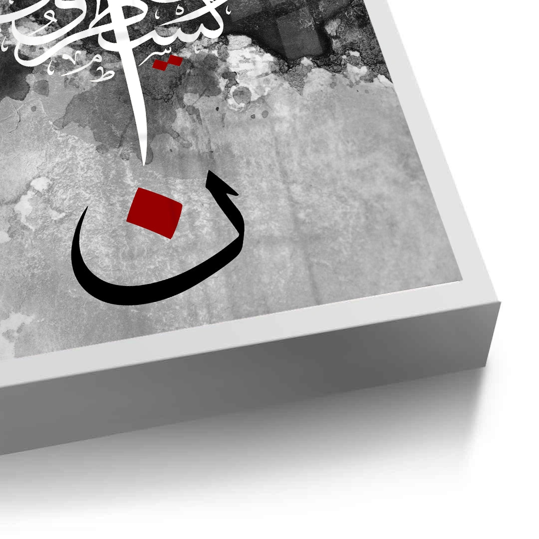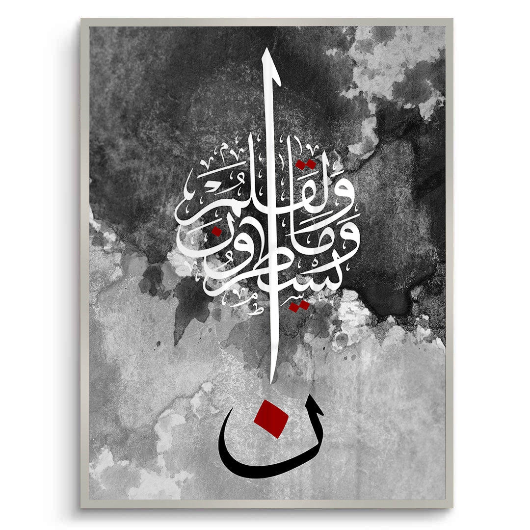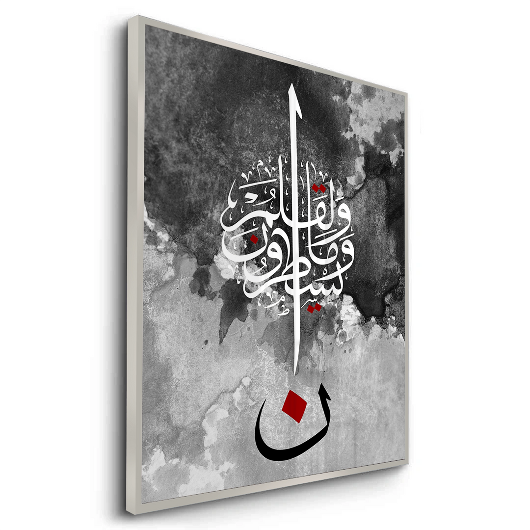 The striking Nūn & The Pen - Abstract Calligraphy print is a powerful, modern piece inspired by Quranic themes, particularly the letter Nūn and the Surah Al-Qalam (The Pen). This high-contrast artwork features intricate white Arabic script against a textural black and grey watercolor background. The composition is anchored by a large, bold black letter 'Nūn' (ن) with a central red accent, creating a dramatic and profound focal point. Ideal for adding a modern, deep, and artistic spiritual statement to a study or living area in Dubai.