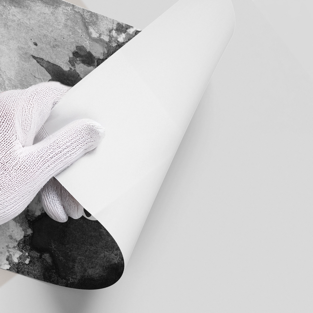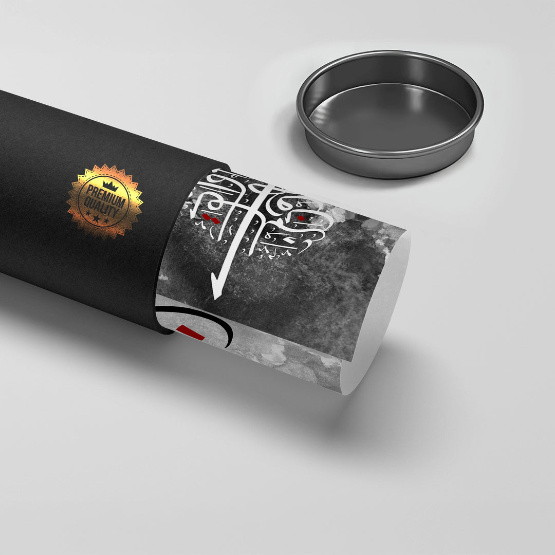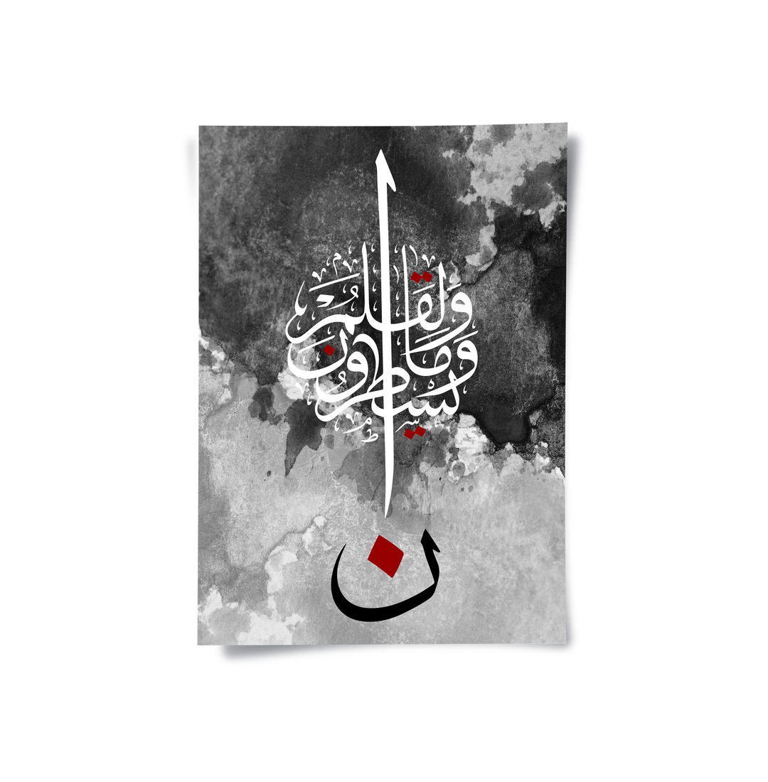 The striking Nūn & The Pen - Abstract Calligraphy print is a powerful, modern piece inspired by Quranic themes, particularly the letter Nūn and the Surah Al-Qalam (The Pen). This high-contrast artwork features intricate white Arabic script against a textural black and grey watercolor background. The composition is anchored by a large, bold black letter 'Nūn' (ن) with a central red accent, creating a dramatic and profound focal point. Ideal for adding a modern, deep, and artistic spiritual statement to a study or living area in Dubai.