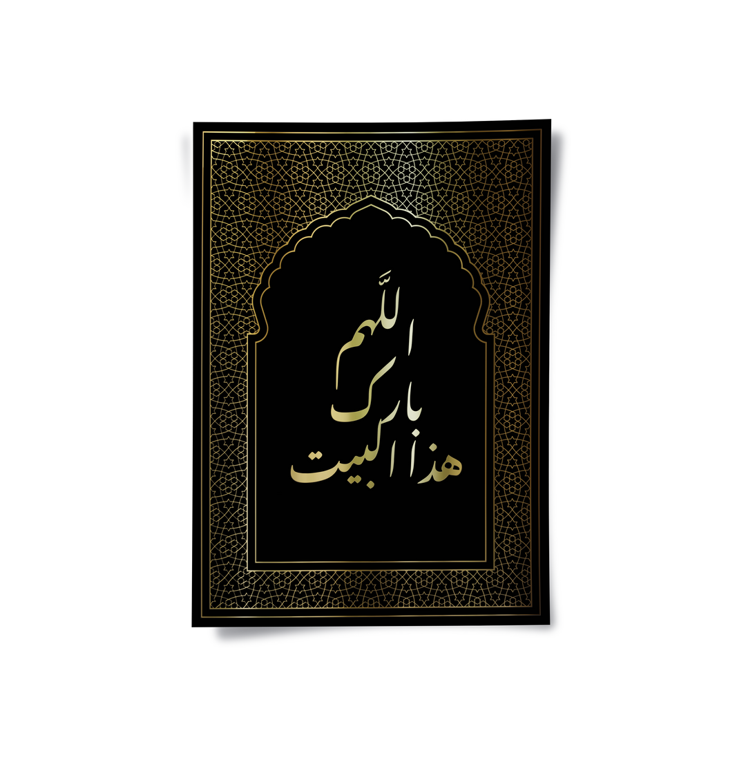 Invite blessings and peace into your home with the Bless This House typography print from Jasmine Art. This spiritual masterpiece features the prayer "O Allah, bless this house" in graceful golden Arabic calligraphy, framed within a beautiful Mehrab and intricate geometric patterns. The regal contrast of metallic gold against a textured black background creates a sophisticated and protective ambiance. Finished with our signature premium vertical texture, this print offers a high-end tactile finish that honors traditional Islamic artistry. An essential addition to an entryway, a family majlis, or a new home in Dubai.
