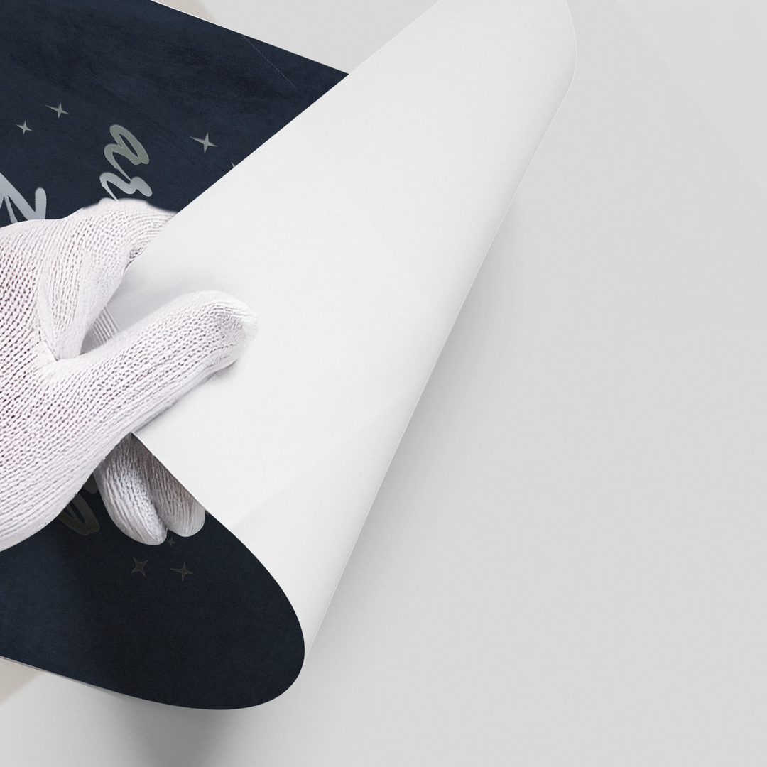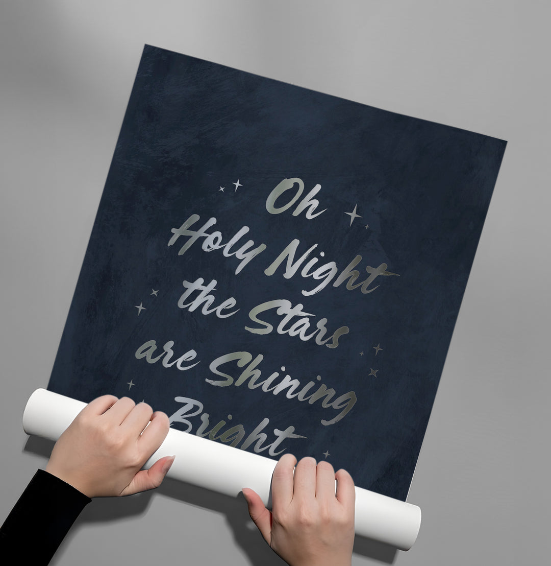 The elegant Oh Holy Night - Silver Christmas Typography print captures the spirit of the festive season with refined sophistication. The cherished carol phrase "Oh Holy Night the Stars are Shining Bright" is beautifully rendered in luminous metallic silver script typography. The design is accented with twinkling silver stars and set against a deep midnight blue, textured canvas with a subtle distressed finish. This artwork adds a luxurious, elegant, and festive touch to any living room, entryway, or mantelpiece in Dubai. Perfect for bringing sophisticated holiday cheer into your home.