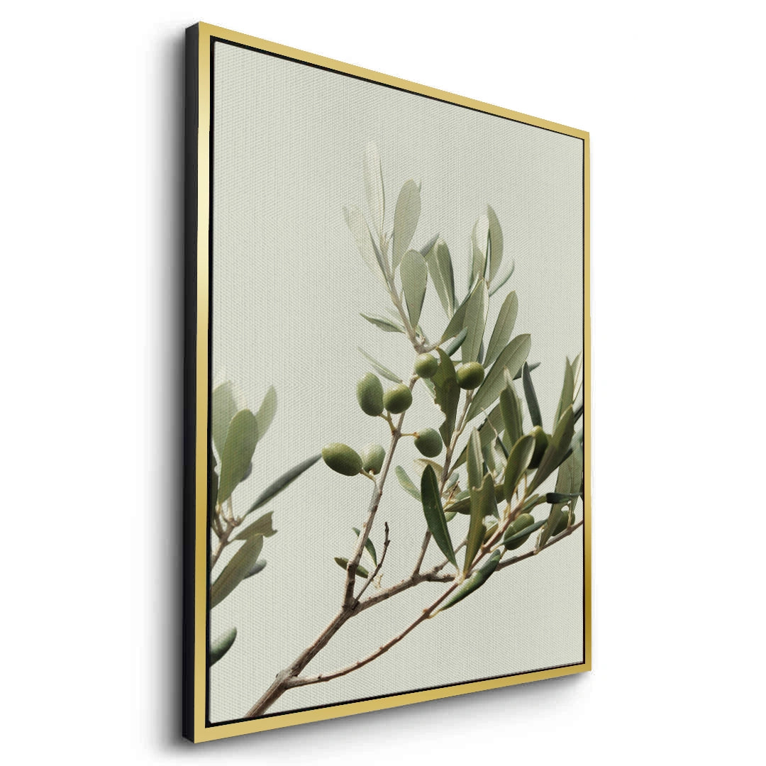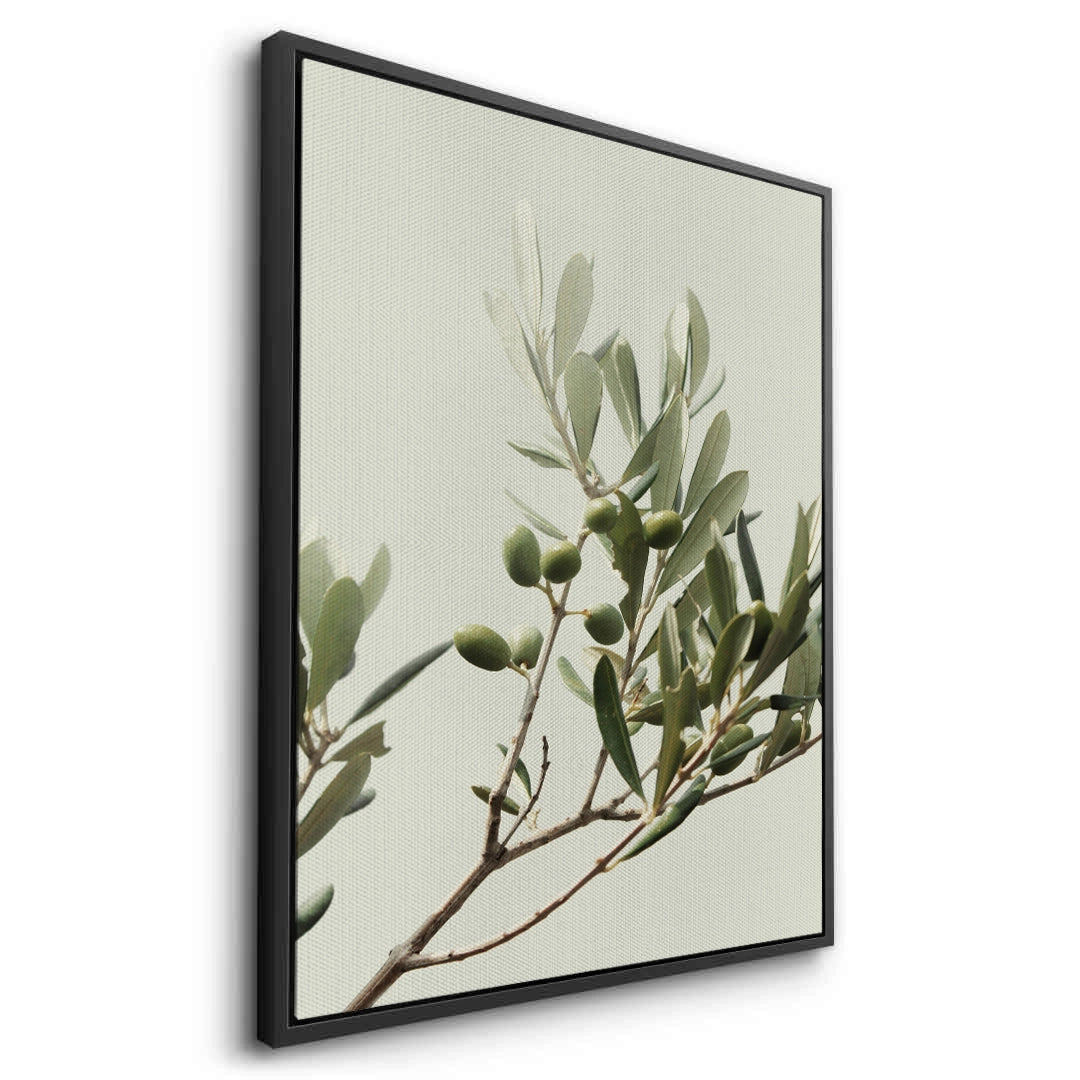 The fresh Olive Branch print captures the simple, enduring beauty of the Mediterranean. This detailed photographic canvas showcases a close-up of an olive branch laden with small green olives and dusty green leaves. Set against a soft, light grey-green background, the image offers a sense of calmness, natural authenticity, and subtle color. It is an ideal piece for bringing a touch of Mediterranean serenity and botanical freshness to a kitchen, dining area, or sunlit room in Dubai.