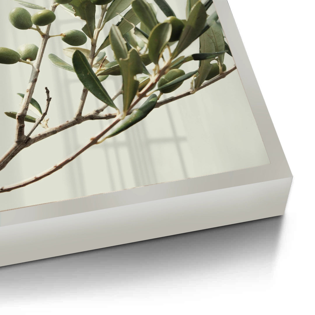 The fresh Olive Branch print captures the simple, enduring beauty of the Mediterranean. This detailed photographic canvas showcases a close-up of an olive branch laden with small green olives and dusty green leaves. Set against a soft, light grey-green background, the image offers a sense of calmness, natural authenticity, and subtle color. It is an ideal piece for bringing a touch of Mediterranean serenity and botanical freshness to a kitchen, dining area, or sunlit room in Dubai.