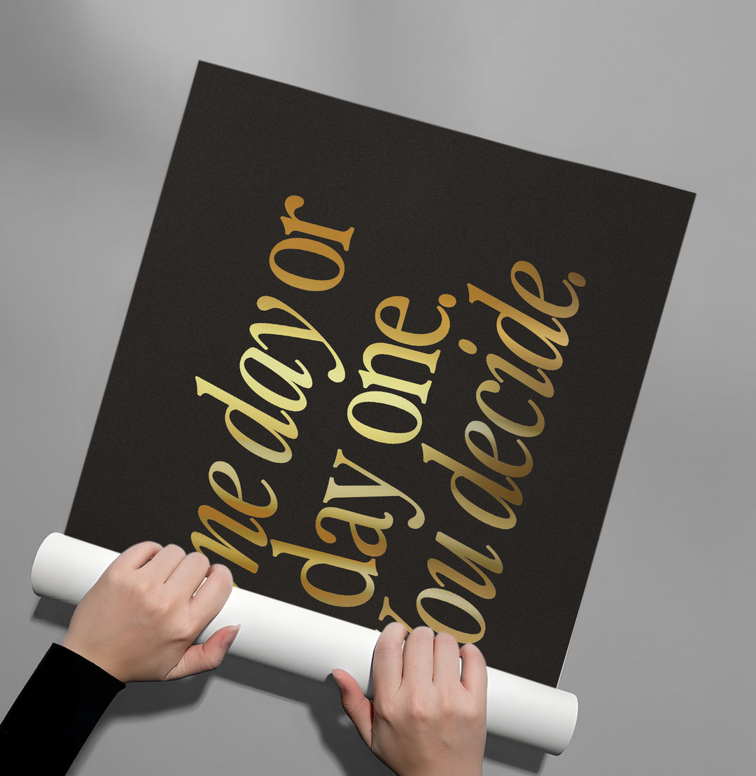 The commanding One Day or Day One - Gold Motivational Typography print is the ultimate call to action disguised in luxury. It features the powerful quote "One day or day one. You decide." rendered in large, expressive metallic gold italic Serif typography. The radiant gold text creates an eye-catching contrast against the deep black, textured pinstripe canvas, emphasizing the sleek, contemporary aesthetic. This piece is ideal for adding an inspirational, sophisticated, and striking focal point to a modern office, gym area, or living space in Dubai—a constant reminder to start today.
