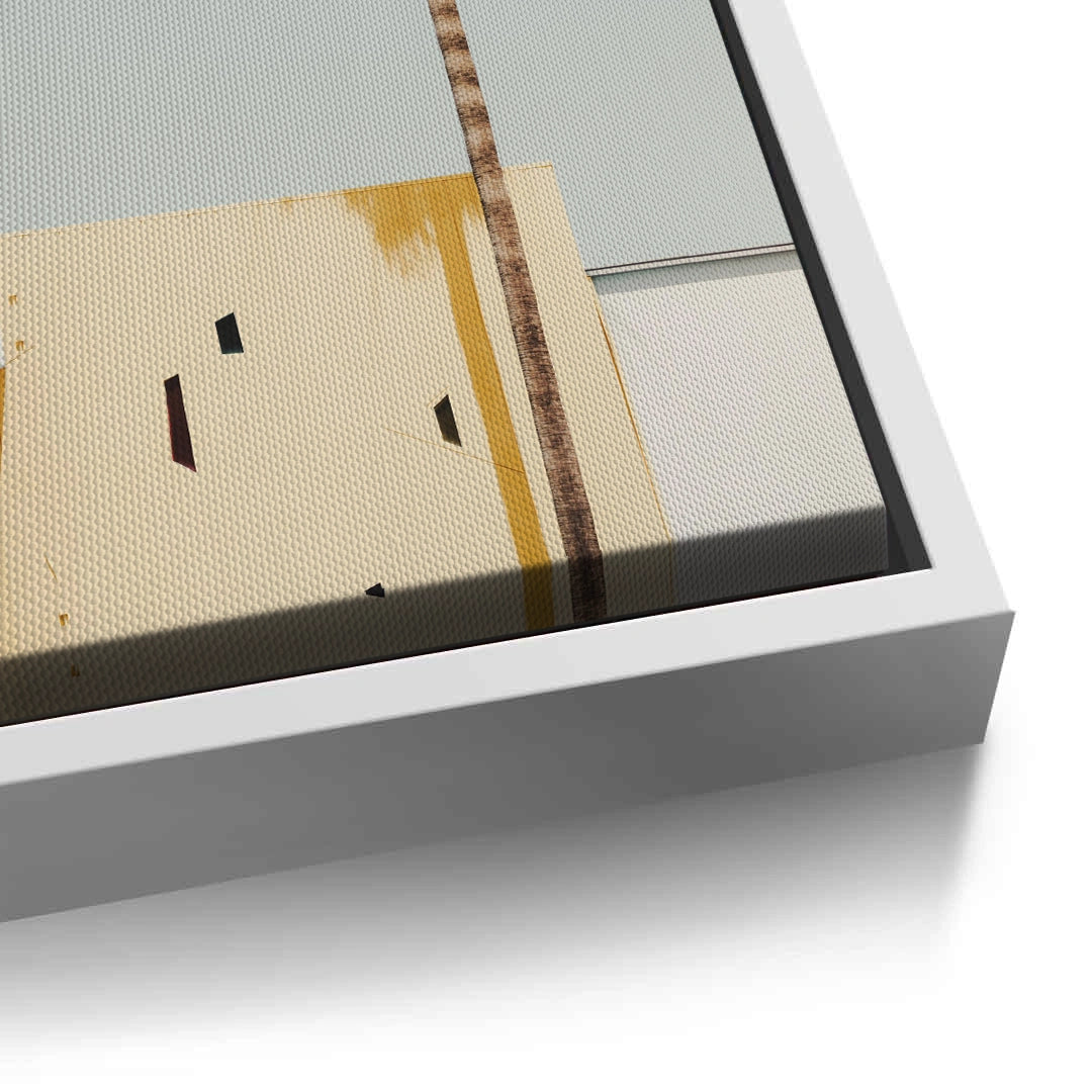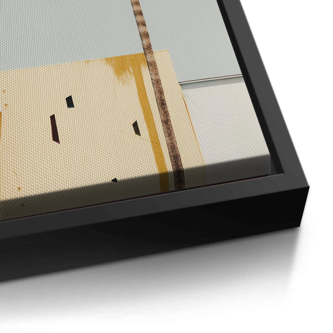 Capture the essence of mid-century desert modernism with the Palm Springs Aesthetic art print. This minimalist piece features a slender palm tree set against a geometric building, where sharp architectural angles and rhythmic shadows create a sophisticated visual balance. The muted palette of sun-washed yellow and soft greys evokes a calm, tropical atmosphere. Finished with our signature premium vertical texture, this print offers a high-end, tactile feel that complements contemporary interiors. Perfect for adding a chic, vacation-inspired vibe to a modern lounge, a bright hallway, or a creative office space in Dubai.