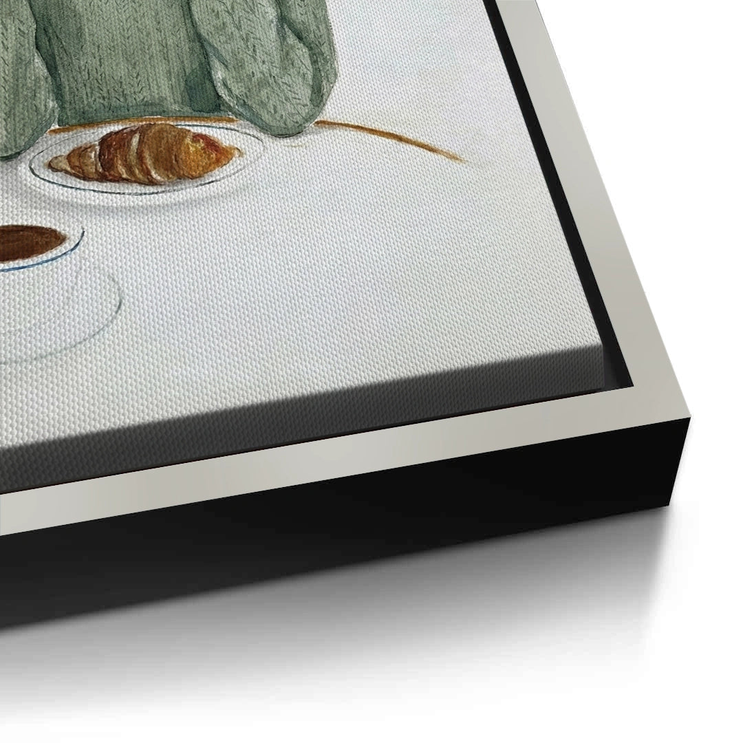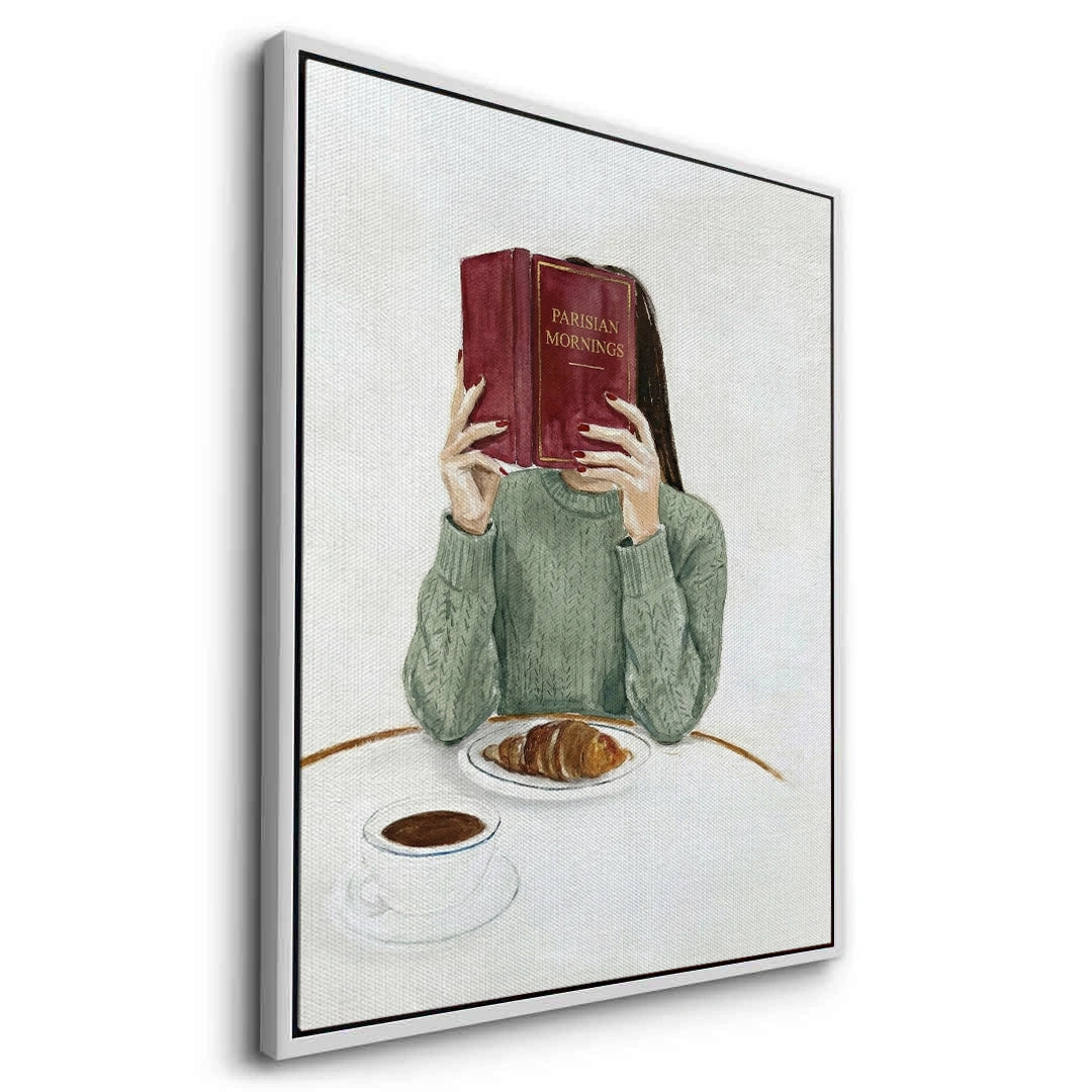 Escape to a cozy French café with the Parisian Morning Watercolor from Jasmine Art’s Bohemian series. This elegant illustration captures the essence of a slow morning, featuring a woman lost in a book titled "Parisian Mornings," paired with a classic croissant and coffee. Its sophisticated sage green and burgundy palette adds a chic, intellectual charm to any modern space. Finished with our signature premium vertical texture, this print offers exceptional tactile depth and a high-end gallery finish. A perfect lifestyle accent for a cozy reading nook, a stylish kitchen, or a modern bedroom in Dubai.