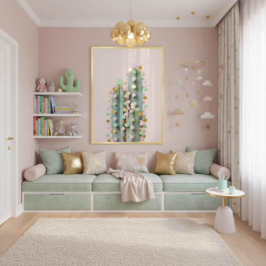 This modern print features a charming cactus rendered in soft, trendy pastel tones. The Pastel Cactus is a playful yet sophisticated piece that adds a touch of desert chic to a contemporary nursery or playroom in Dubai.